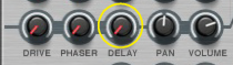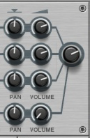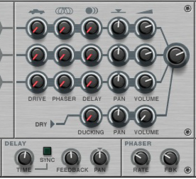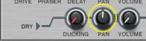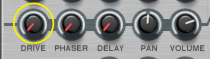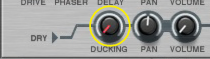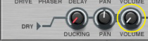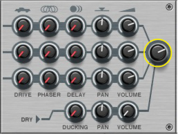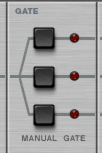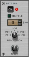Like all effect devices, Alligator features a Bypass/On/Off switch and an input level meter. These are described in “Common effect device features”.This is where you select which one of the 64 built-in patterns should play back, controlling the gates. There is a guide to the patterns in “The built-in patterns”.