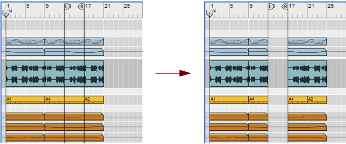 Inserting bars The “Insert Bars Between Locators” function on the Edit menu, or context menu, can be used for inserting empty bars between the Left and Right Locators. All clips that intersect the locator positions on all tracks after the Left Locator are split and moved to the Right Locator to make room for the inserted bars. Different tracks with lanes before and after insertion of 4 extra bars between bars 13-17.