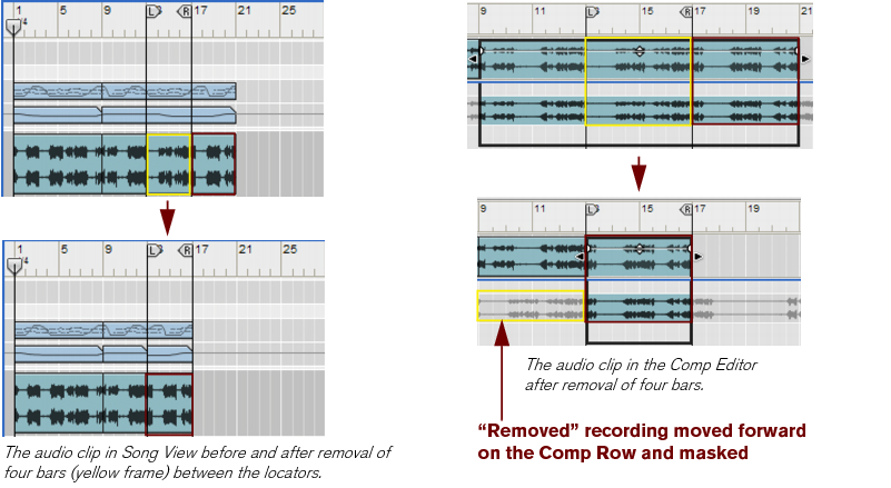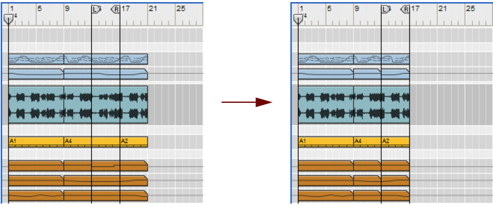 Removing bars The “Remove Bars Between Locators” function on the Edit menu, or context menu, removes all events between the Left and Right Locators. All clips that intersect the locator positions will be cut (when necessary), and the cut section (between the locators) will be removed. All clips that originally were located to the right of the Right Locator will then be moved to the Left Locator, closing the gap. Different tracks with lanes before and after removal of 4 bars starting at bar 13. Any removed note and parameter automation events between the Left and Right Locators will be deleted! About removing bars that contain audio recordings As opposed to note and parameter automation events, audio recordings in removed bars will not be deleted. Instead, they will be placed on a Comp Row and masked. If we open the second audio clip in the previous example in Edit Mode, we can see that the audio recording in the removed bars has been moved forward and masked: