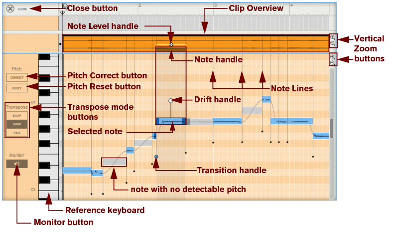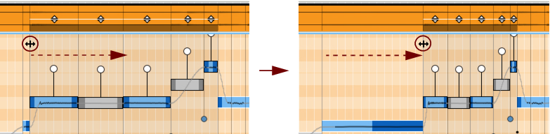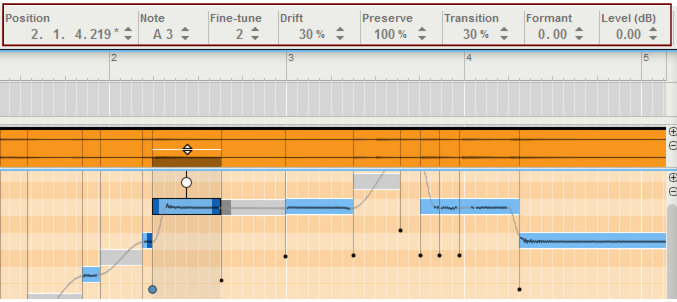 The Transition handle(s) control the pitch transition times between the selected note(s) and the previous adjacent note(s). To preserve the natural small pitch fluctuations (vibrato and other expressions), use the Preserve Expression parameter in the Inspector, see “Preserve”.