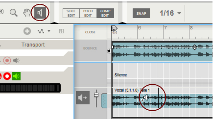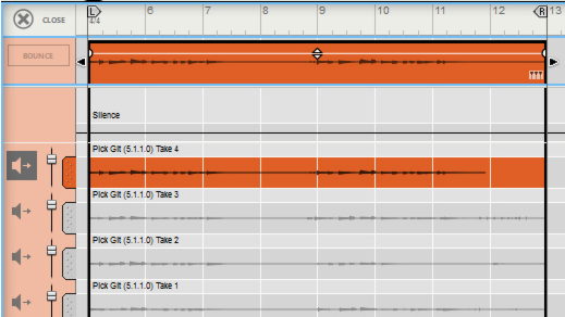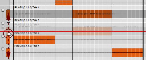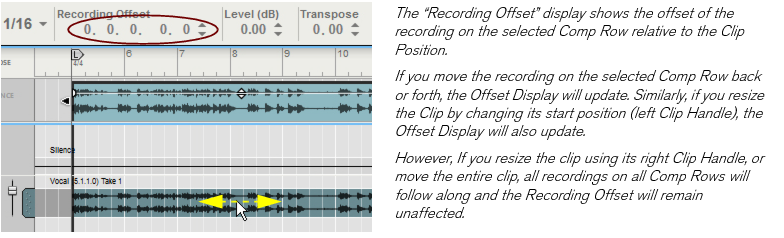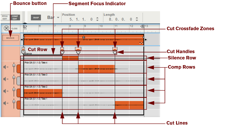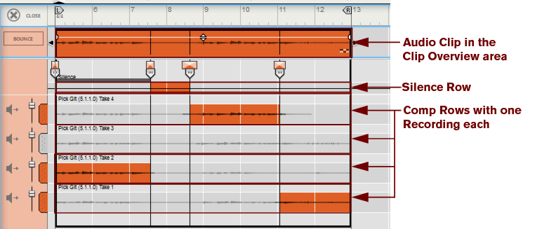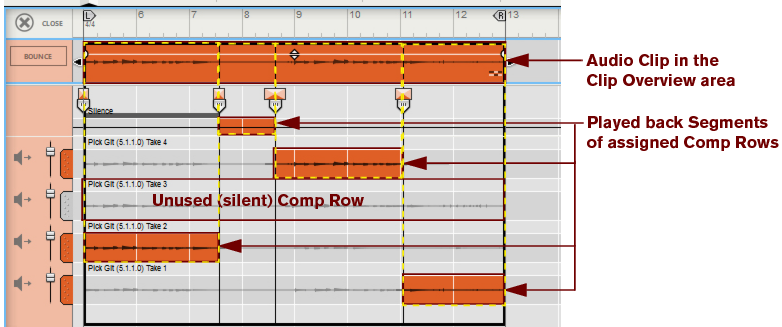 • Depending on how you recorded the audio clip, there can be one or several Comp Rows, containing one audio recording each. Comp Rows can be described as “virtual tracks” in the sense that you can have many parallel Comp Rows in an audio clip but only play back from one Comp Row at a time (see “Creating a comped audio clip”). In Single Take clips, only the audio recording on the currently selected Comp Row will play back.A Comp clip consists of several Comp Rows, with one recording on each Comp Row. If you have recorded several takes in an audio clip and want to cut out sections of the various takes and comp into a final clip, this can be done in the Comp Editor (see “Creating a comped audio clip”). This is how an already comped audio clip could look like in Comp Edit mode:
