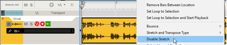 Audio and tempo matching Matching an imported audio clip to the song tempo Audio files created by the Export or Bounce functions in Reason include information about their original tempo. When you import such an audio file, it will automatically be stretched to fit the tempo in the new song. However, if you have imported an audio clip which has a steady, but unknown, tempo, you can adjust the imported clip to the song tempo. You can either use the Clip Tempo Scaling function to manually “stretch” the audio clip as described in “Tempo scaling Clips”. Another way is to disable the automatic stretch for the audio clip and then adjust the sequencer tempo to match the clip. This is done in two steps: first you adjust the song tempo to the imported audio clip without Stretch enabled and then adjust the song tempo back to original - with Stretch enabled on the audio clip: 1. Select the clip containing the imported audio file and choose “Disable Stretch” from the Edit menu or context menu. Disabling Stretch makes the audio recording in the clip play back at the same tempo regardless of song tempo in the sequencer. Disabling Stretch on a clip containing an imported audio recording. 2. Start the sequencer and adjust the sequencer Tempo, up or down, to match the tempo of the audio recording in the clip. If necessary, enable the metronome click in the sequencer to get an audible tempo reference. Continue adjusting the tempo of the song until it matches the tempo of the audio recording. 3. Adjust the length of the clip so that it plays the entire audio file (or as much as you want). 4. Select the clip and select "Bounce > Bounce Clip to New Recording" from the Edit menu or context menu. The new recording will sound the same, but include information about the tempo you set in step 2. 5. With the audio clip still selected, choose “Enable Stretch” from the Edit menu or context menu. 6. Adjust the song tempo back to the original BPM. As you adjust the song tempo, the tempo of the audio recording will follow along accordingly - without affecting the original pitch of the recording. This is done by stretching the audio. Reason does this automatically in two parallel steps: a real-time “preview” stretch so that you can instantly hear the result of your tempo changes, then a high quality stretch “in the background” to further improve the sonic results. As soon as high quality stretch is in progress, the “Calc” indicator on the Transport Panel shows a progress meter: The CALC progress meter appears when Reason performs high quality stretching of audio. Since the high quality stretch is performed in the background, you can still continue to work with your song without any interruption. When the high quality stretch data has been calculated, the Calc indicator goes out and the high quality audio data will be heard on playback.