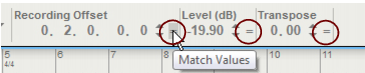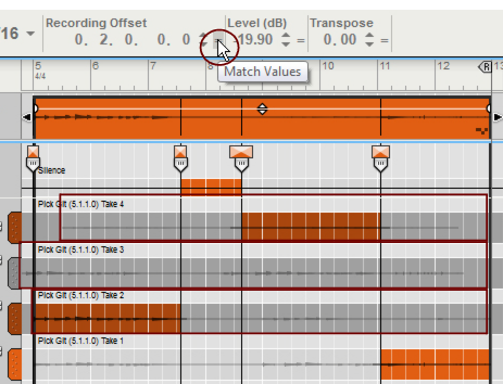 Editing audio using the Inspector The Inspector can be used for editing audio recordings numerically. For Inspector editing specific to Pitch Edit mode, please refer to “Audio pitch editing in the Inspector”. Editing recordings and cuts in the Inspector If you select a Comp Row, the three displays change to show the Recording Offset, Comp Row Level and Comp Row Transpose value: If you select a Cut Handle in Comp Mode, two displays appear, showing the Cut Handle’s Position and Crossfade time: Edit the values by clicking on a segment in a display and then dragging up/down, using the up/down spin controls, or typing in new values. Snap is not taken into account. See “Inspector segment displays” for details on how to edit in the Inspector displays. Editing multiple recordings or multiple cuts in the Inspector When you edit values for several selected Comp Rows or objects (Cut Handles etc.), the changes will always be relative. For example, if you change the Recording Offset, Level or Transpose values when several Comp Rows are selected, the recordings will all be changed by the same amount; their relative values will be retained. • If several Comp Rows are selected, the displays will show the values for the topmost selected Comp Row. • If several Cut Handles are selected, the displays will show the Position and Crossfade values for earliest Cut Handle in the clip. • If several Comp Rows, or several Cut Handles, are selected and any of their values differ, Match Value buttons appear next to the corresponding display. For Cut Handles, only Crossfade values can be matched - not the Positions. See “Matching audio values using the "Match Values" function”. • If Comp Rows and Cut Handles are selected in combination (e.g. for moving Cuts and recordings together as a group), no displays are shown in the Inspector. Matching audio values using the "Match Values" function The Match Values buttons appear as ‘=’ signs. The “Match Values” function in the Inspector can be used for matching Recording Offsets, Comp Row Levels and Transpose values of several selected Comp Rows to the offset/level/value of the topmost selected Comp Row. It can also be used for matching Cut Crossfade values of several selected Cut Handles to the Crossfade value of the Cut Handle with the earliest start position in the clip. The “Match Values” function can also be used for matching the following parameters of several selected notes in Pitch Edit mode: Note, Fine-tune, Drift, Preserve Expression, Transition, Formant and Level. See “Audio pitch editing in the Inspector” for more info. Matching Recording Offsets Matching Recording Offsets is useful if you want to make sure that the Recordings on multiple Comp Rows start at the exact same position. 1. Select more than one Comp Row and then place the Selection Tool on the Recording Offset Match Value button. Three selected Comp Rows (the three topmost). The topmost Comp Row has the Recording Offset set to 2 beats. 2. Click the Match Value button to the right of the “Recording Offset” display. The Recording Offsets on all selected Comp Rows have now been moved to 2 beats. The Recording Offsets of the recordings on the three topmost Comp Rows have been moved to 2 beats. Matching Comp Row Levels Here’s an example showing how to match Comp Row Levels: Select several Comp Rows and then click the Level Match Value button. The Levels on the three selected Comp Rows are matched and adjusted to -19.90 dB. Matching Comp Row Transpose values Select several Comp Rows and then click the Transpose Match Value button. The transposition is matched to the Transpose value of the topmost selected Comp Row. Matching Cut Crossfades Matching Cut Crossfades is a time-saving function if you want to apply the same Crossfade times to several Cuts throughout the clip. If you want to eliminate any clicks between segments in your comped clip, you could apply a Cut Crossfade to the first Cut and then match the other Cuts to get the same Crossfade times in one go: Select several Cut Handles and click the Cut Crossfade Match Value button. The Crossfades of the selected Cuts are matched and adjusted to the Crossfade times of the earliest selected Cut.