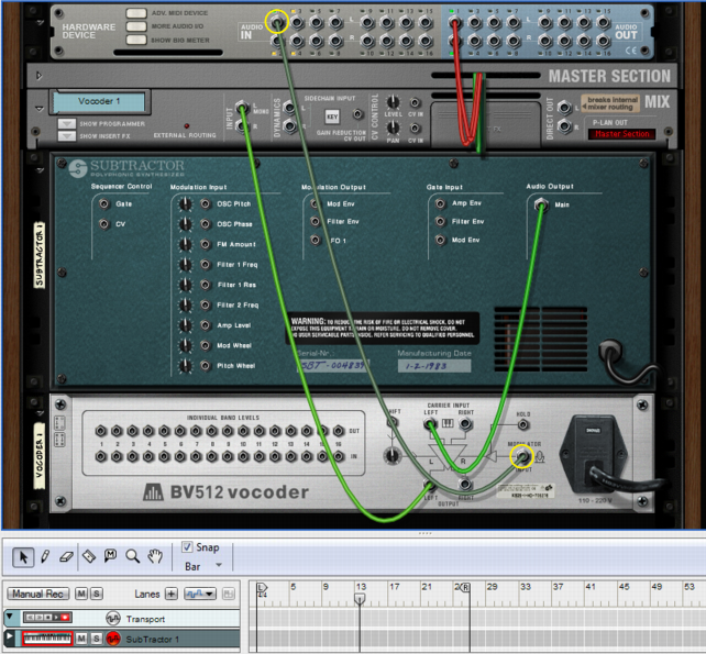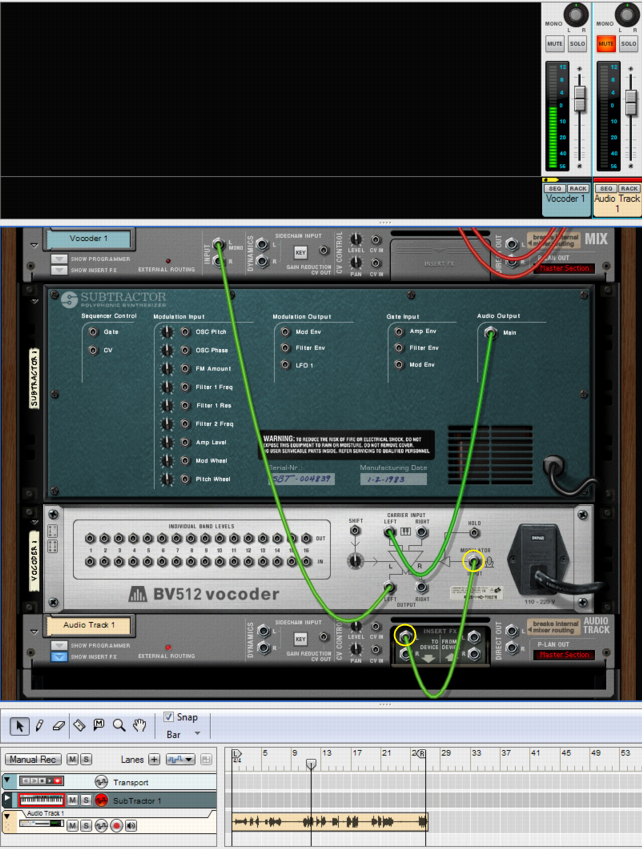 This tutorial describes how to connect and use a typical vocoder setup. We assume here that you have a MIDI keyboard connected. For details on the parameters, see “BV512 parameters”.It’s important to have high frequencies (a lot of harmonics) in the carrier. On the Subtractor, a simple but effective carrier sound would be based on a sawtooth wave, with the filter fairly open. For more about choosing carrier sounds, see “Choosing a carrier sound”.See “BV512 parameters” for details.Refer to “Recording audio from Mix Channel outputs” for more details on how to record Mix Channel outputs.
