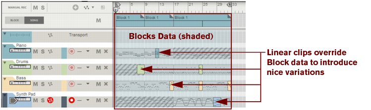 Introduction The arrangement in the sequencer has two basic views: the Song View, which is exactly the same as the “Arrange Mode” in previous versions of the program, and the Blocks view. The Block View is designed for creating shorter multi-track “sections” that can be repeated anywhere in the song arrangement. In most situations a Block would probably consist of 4-8 bars. An analogy to a Block would be a traditional drum machine pattern where you would record several (drum) instrument tracks and save as a complete “pattern”. Then, you would build up your song arrangement by arranging your patterns, one after another, with repetitions etc. The Song and Block Views share the same Track List but use separate clips and recordings. Any track and clip types can be used when working with Blocks, e.g. instrument tracks with note clips, audio tracks with audio clips, automation tracks with parameter automation clips and pattern tracks with pattern automation clips. 32 different Blocks are available in the program and each Block can be reused and repeated in the song arrangement as many times as you like. By working with Blocks you can create complete verse and chorus blocks and arrange and reuse them as desired in the song. When you arrange your Blocks in the song - using Block Automation Clips - you can also choose to temporarily mute desired lanes for the duration of each Block Automation Clip to create variations. The idea behind Blocks Working with the sequencer in a “pattern based” fashion appeals to many users. It is the way traditional hardware sequencers worked when they were first introduced on the market. The linear working method of most software sequencers also have many advantages. So, why not combine these two basic working methods to get the best of both worlds! A very neat way of working with Blocks is by combining Block data with regular linear song data. In the picture below, Block data is being used as base for the song. Then, a number of shorter linear clips are used to override parts of the Block data to introduce nice variations in the song: Linear clips override Block data to create nice variations in the final arrangement.