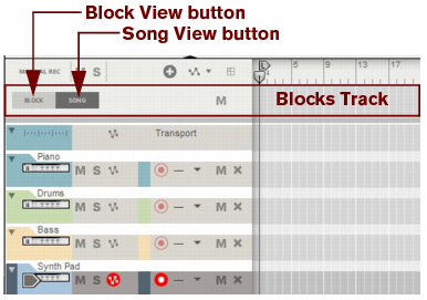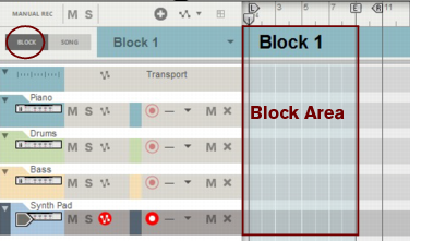 A colored area appears on the arrangement pane with the Block name at the top on the Blocks Track. By default, the Blocks are named “Block n” where “n” is a number between 1 and 32. If you like, you can rename your Blocks to more suitable names (see “Renaming Blocks”). The Block View is where you record the clips you want to include in a specific Block. The clips present in the colored Block area in the Block View are unique only to that specific Block.