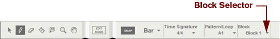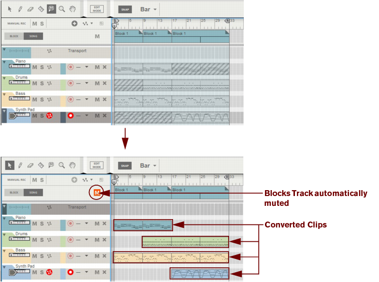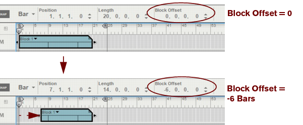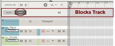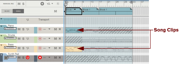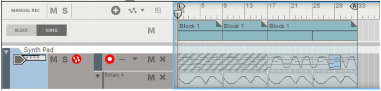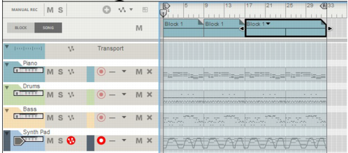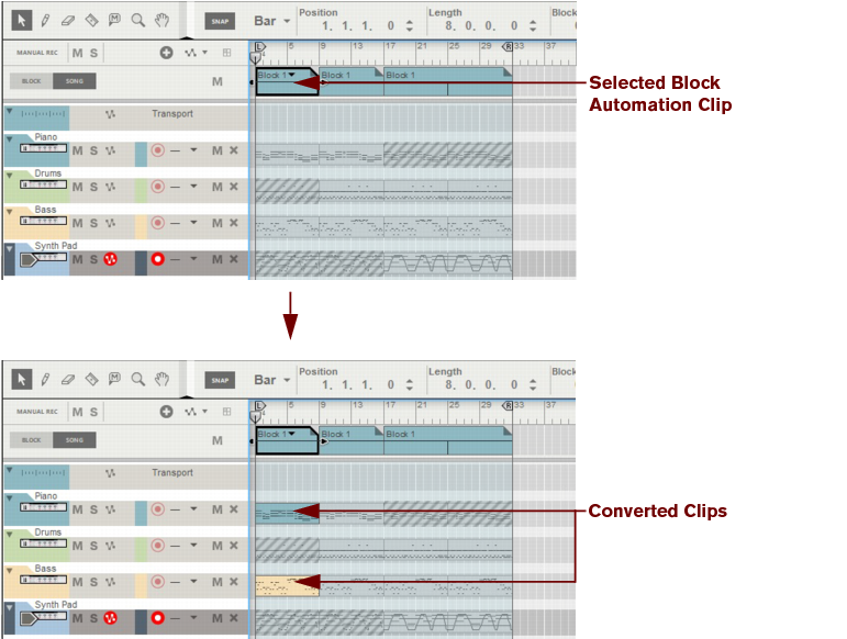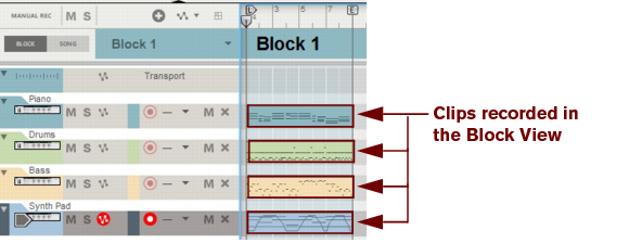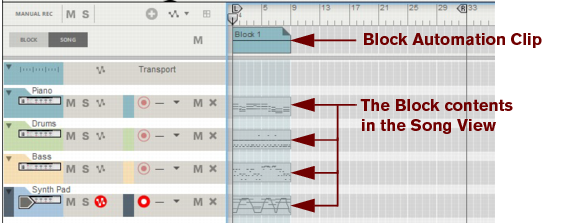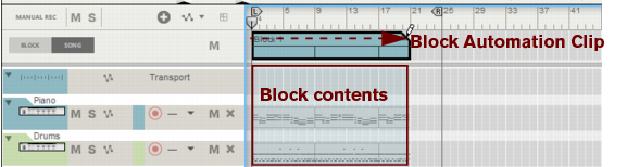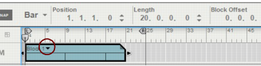 The following section describes functions and routines that are specific to Block Automation Clips. General clip handling procedures (e.g. naming, coloring etc.) are described in the general “Clip handling” section.The contents (clips and events) of Block 1 are displayed on the respective sequencer tracks in a ghosted fashion on a colored background. This way you will see what events and/or recordings the Block will play back. This also allows for muting of individual lanes in the Block (see “Muting lanes in Block Automation Clips”).