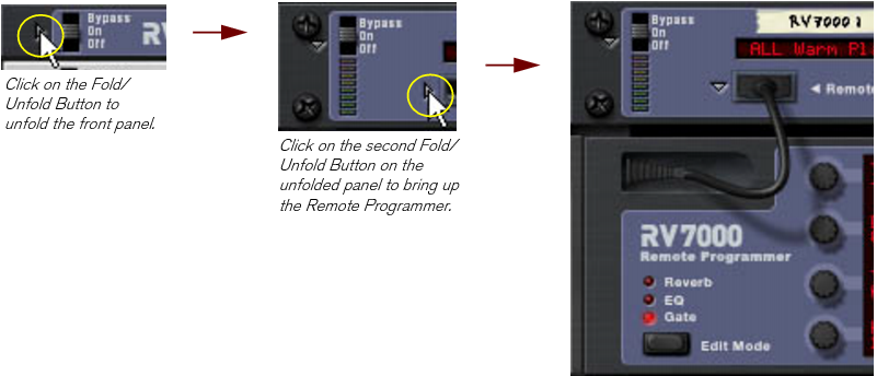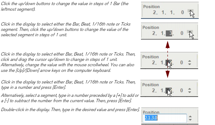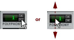Editing parameters Since a large part of Reason is laid out like “real” hardware devices, such as the Main Mixer, instrument and effect devices etc., almost all controls are designed like their real world counterparts - mixer faders, effect unit knobs, transport buttons, etc. How to adjust these controls is described in the following paragraphs. Knobs To “turn” a knob, point at it, hold down the mouse button and drag up or down (as if the knob was a vertical slider). Dragging upwards turns the knob clockwise and vice versa. If you press [Shift] and drag, the knob will turn slower, allowing for higher precision. You can also adjust the knob precision with the “Mouse Knob Range” setting on the General page in Preferences. This dialog is opened from the Edit menu (or from the Reason menu if you are running Mac OS X). To reset a knob to its default value (usually zero, center pan or similar), press [Ctrl](Win) or [Cmd](Mac) and click on the knob. Faders and sliders To move a fader or slider, click on the handle and drag in the fader/slider direction. You can also click anywhere on the fader/slider to instantly move the handle to that position. If you press [Shift] and drag, the fader/slider will move more slowly, allowing for higher precision. To reset a fader/slider to its default value (usually zero, 100, center pan or similar), press [Ctrl](Win) or [Cmd](Mac) and click on the fader/slider handle. Buttons Many functions and modes are controlled by clicking buttons. Many of the buttons in Reason have a “built-in” LED, or the button itself lights up, indicating whether the button is on or not. Fold/Unfold buttons Fold/Unfold buttons are distinguished by a small triangle at the top to the left on a device. Clicking on a Fold/Unfold button will unfold the device panel so that more controls are visible and can be accessed for editing on the screen. On some devices, such as the RV7000 Advanced Reverb, there are more than one Fold/Unfold button. Clicking on the second Fold/Unfold button on the unfolded front panel will open up the Remote Programmer panel from which more parameters can be accessed: The Fold/Unfold buttons on an RV7000 Advanced Reverb device. Multi Mode selectors Some parameters allow you to select one of several modes. There are two different graphical representations of this in Reason. The multi mode selector type below consists of a button with the different modes listed above it: Click the button to step through the modes or click directly on one of the modes printed on the panel, or click on the corresponding LED, to select mode. The currently selected mode is indicated by a lit LED. The multi mode selector type below is a switch with more than two positions: To change mode, click and drag the switch, or click directly at the desired switch position (just as when adjusting a slider). Numerical controls In Reason devices, numerical values are often displayed in numerical displays with “spin controls” (up/down arrow buttons) on the side. Some parameter values, such as oscillator and LFO waveforms, are displayed graphically in the displays. There are two ways of changing values in these types of controls: By using the up and down buttons on the spin controls. To adjust a value in single steps, click on its up or down arrow button. To scroll a value continuously, click on an arrow button and keep the mouse button depressed. By clicking and holding the mouse button depressed in the actual display and then dragging the mouse up or down. This allows you to make coarse adjustments very quickly. Alpha-numeric controls In Reason, alpha-numeric values and/or device presets are displayed in alpha-numeric readouts with “spin controls” (up/down arrow buttons) on the side. There are two ways to change alpha-numeric/preset values: By using the up and down buttons on the spin controls. To adjust a value or select a preset in single steps, click on the up or down arrow button. To scroll a value continuously, click on an arrow button and keep the mouse button depressed. By clicking and holding the mouse button depressed in the actual alpha-numeric display and selecting from the list that appears. This allows you to make coarse adjustments very quickly or to immediately change to a preset anywhere in the list. This type of control is used to select, e.g., patch and reverb algorithms and some oscillator waveforms. Numerical segment displays In the numerical segment displays on the sequencer Transport Panel and in the sequencer Inspector, values can be edited in a number of different ways. The editing principle is exactly the same for the Transport Panel and Inspector displays, which is shown in the two examples below. Transport Panel segment displays The segment displays of the Transport Panel can be edited as shown in the following Tempo display examples. The Tempo display segments show (from left to right) BPM and 1/1000 BPM: The other segment displays on the Transport Panel can be edited in the same way as described above. Some displays also features up/down arrow buttons. Inspector segment displays The segment displays in the Inspector can be edited as shown in the following Position display examples. The Position display segments show (from left to right) Bars, Beats, 1/16th Note and Ticks: The other segment displays in the sequencer Inspector can be edited in the same way as described above.