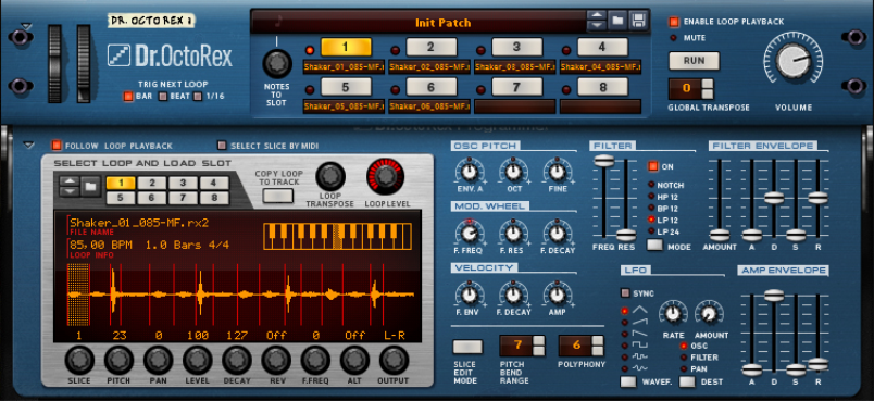 The Dr. Octo Rex Loop Player is capable of playing back and manipulating files created in ReCycle, another product created by Propellerhead Software, or bounced from open Single Take audio clips in Reason (see “Bounce Clip to REX Loop”). ReCycle is a program designed especially for working with sampled loops. By “slicing” an audio loop and making separate samples of each beat, ReCycle makes it possible to change the tempo of loops without affecting the pitch and to edit the loop as if it was built up of individual sounds.