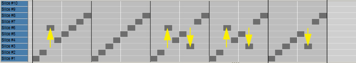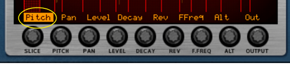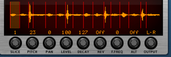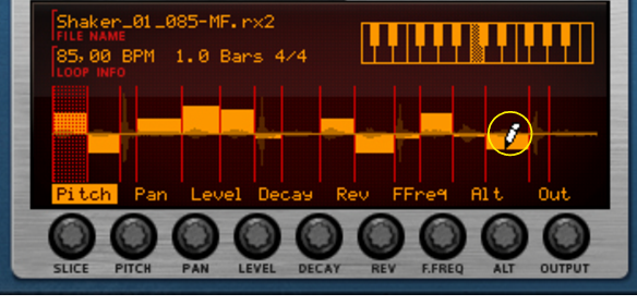 Here you can edit the notes that play the slices. There is a special REX edit lane for editing REX slice notes, with the notes indicated by the slice numbers instead of by pitches. Editing notes in the sequencer is described in the “Note and Automation Editing” chapter.Here you are able to edit several parameters for each slice, by first selecting the slice and then using the knobs below the waveform display. If you want to edit a single parameter for several slices at once, a more convenient way would be to use the Slice Edit Mode, see “The Slice Edit Mode”. The following slice parameters can be set: