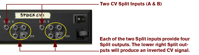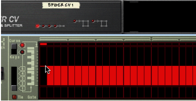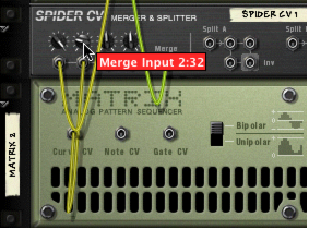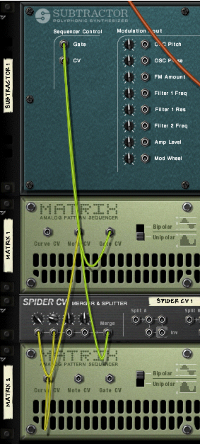 Spider CV Merger & Splitter The Spider CV Merger & Splitter is not an effect device, but a utility. It has two basic functions: To provide one merged CV output from up to four CV input sources. To split CV or Gate inputs into several outputs. Two inputs, A and B, are provided, each with four outputs, where one of the outputs will invert the polarity of the control signal. One reason for having two splitable inputs is to make it possible to split Gate and Note CV, to control several instrument devices with one Matrix for example. There are no controls on the front panel of this device, only CV signal indicators. The four horizontal indicators light up to indicate signals connected to the corresponding merge input. The two indicators to the right indicate signals connected to the corresponding split inputs. Merging CV On the back panel of the Spider there are several CV connectors. The left half of the panel contains four CV/Gate input connectors with associated trimpots, and to the right of these, one merged CV output. The merged CV output will produce a CV signal that represents the “sum” of all connected CV inputs. A few things to note: • Gate CV signals typically trigger notes or envelope cycles and are normally routed to a Gate input. • CV signals typically control note pitch or for modulating parameters and are typically routed to CV Note or Modulation inputs. There are no strict rules involved, but the facts mentioned above means that it is generally better to stick to using either Gate CV signals or CV signals but not a mixture when merging. simply because the CV/Gate signals usually go to different input destinations. For instance, merging Note CV and Gate CV from a Matrix does not make much sense if you want to use Matrix to play melodic patterns via the Sequencer Control inputs of an instrument device. There would only be one merged output whereas the instrument device would need a separate Gate and Note CV signal to work properly. Practical uses of merging CV The practical applications of merging CV are perhaps less obvious compared to splitting CV. But there are numerous applications for a merged CV control output, a few of which are listed below: You can create interesting modulation effects by merging several Modulation outputs from LFO’s and other CV modulation sources. For example, merging the Modulation outputs from several LFO’s would produce a “mixed modulation” output. This merged output signal could be likened to a “super LFO” capable of generating several modulation cycles simultaneously, each with a different waveform and modulation rate! In addition to this, by using the trim control for each CV input, you have full control over the amount of modulation applied by each LFO. The above example could of course also include Curve CV outputs from a Matrix or Mod Outs from Malström etc., in short any CV Modulation output. Use the ECF-42 Filter to apply envelope controlled filter effects. This can create the sound of “synthesized” percussion, and other interesting effects. This is done using the following method: 1. Connect the audio outputs of a Redrum to a ECF-42 Envelope controlled filter. 2. Connect the Gate outputs from up to 4 Redrum drum channels to the merge inputs of a Spider CV. 3. Route the merged output to the Env Gate input on the ECF-42. If you add a touch of velocity the connected Gate signals will trigger the ECF-42 filter envelope. Again, the trim pots on the Spider allows you to adjust the amount of filter envelope applied. Create an “arpeggiator” using two Matrix devices and the Spider CV Merger & Splitter. By merging the Note CV output from one Matrix with a Curve CV output of another Matrix, you can transpose the Matrix pattern in real-time, a bit like an arpeggiator. 1. Create a Subtractor and a Matrix device. Connect the Matrix Note and Gate CV outputs to the Subtractor Sequencer CV and Gate inputs, respectively. 2. Program a pattern for the Matrix. In the following text this is referred to as “Matrix 1”. 3. Now create a Spider CV and a second Matrix device and connect them as in the picture below. Note that the Note CV output from Matrix 1, and the Curve CV output of Matrix 2 should be connected to the Spider. The merged output is connected to the Sequencer Control Note CV input on the Subtractor. 4. On the Spider CV, turn the trimpot for the input connected to the Note CV output fully to the right. This setting will retain the correct pitch relationship for the notes played by the pattern. 5. On the Spider CV, turn the trimpot for the input connected to the Curve CV output to “32”. This will produce a Curve CV output that corresponds to semitone steps. 6. Set the Curve type switch to “Bipolar” on the back of the second Matrix (Matrix 2). 7. Flip the rack around so that the front panels are showing, and make the following settings for the “Matrix 2”: • Set the number of steps to “1”. • Set the Curve/Keys switch to “Curve”. 8. Adjust the Matrix 2 curve for step 1 (the only step used) so that it is in the middle of the bipolar curve as the picture shows. 9. If you now activate Play from the transport, the pattern you programmed for Matrix 1 is played back. By carefully adjusting the Matrix 2 Curve step 1 up or down the Matrix 1 pattern is transposed in semitone steps. By programming different values for the “pattern” played by Matrix 2 and saving them in different pattern locations, you can use the Pattern selectors to transpose the Matrix 1 pattern to different keys! Splitting CV On the right half of the back panel you will find two split inputs “A” and “B”, each with four output connectors. The signal connected to a Split input will be output by all four corresponding outputs, where one is inverted. Practical uses of splitting CV There are many practical uses of splitting CV signals - here are a few examples: Connecting the CV Note and CV Gate outputs from a Matrix to Split Input 