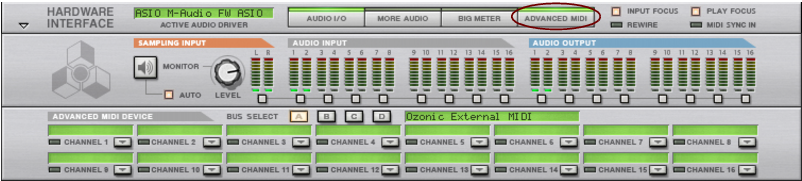 Advanced MIDI Device This is opened by clicking the “ADVANCED MIDI” button on the Hardware Interface panel. The Advanced MIDI device is only used if you are controlling Reason from an external sequencer, using the External Control Bus inputs. Normally, you send MIDI to a track via the sequencer, by selecting the sequencer track. You can select MIDI ports for up to four External Control Busses (on the Sync page in Preferences). Each bus can host 16 MIDI channels, for a total of up to 64 MIDI input channels. The Advanced MIDI Device is where you can route each MIDI channel to a specific device in the Reason rack: 1. Select one of the External Control Busses by clicking the corresponding Bus Select button at the top of the Advanced MIDI device. 2. Pull down the device pop-up menu for a MIDI channel and select a device. The menu lists all devices in the current song. Now, incoming MIDI data on the selected bus and MIDI channel is sent directly to the selected device, bypassing the Reason sequencer. The name of the device is shown in the name field for that MIDI particular channel. 3. Try sending MIDI notes from the external sequencer, on the selected bus and MIDI channel. The indicator below the channel's name field should light up. See also “Advanced MIDI - The External Control Bus inputs” in the Advanced MIDI and Synchronization chapter.