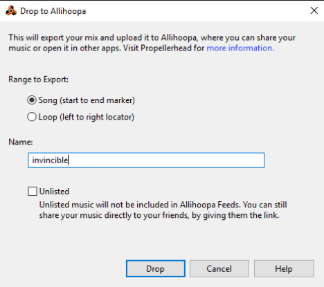 In addition to the regular audio export and bounce functions, you can drop a song or a part of a song to your Propellerhead account, where you can play it back and also use it in other Propellerhead applications. You can also share your uploaded songs with others, see “Drop to Allihoopa”.