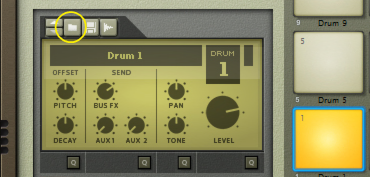 4. These parameters are described in “The Drum Control Panel”. Note that the Drum Control Panel parameters are “global” for each Drum channel. Each drum sound can consist of a number of different sound and FX modules, each with their separate set of parameters. Refer to “The Drum modules”, “The Support Generator modules” and “The FX modules” for details about all the modules that can be used to build up a complete Drum sound.Note however, that you don’t necessarily need to save the Drum patch - all settings are included when you save a Kong Kit Patch (see “Saving Kit Patches”) and/or your song.