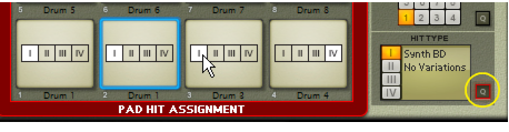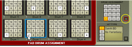 Kong features 16 pads and 16 Drum channels, as described earlier. Each pad can control a separate Drum sound channel. You can also assign several pads to control a single Drum sound channel. This is especially useful if you want to apply different settings, like Hit Types (see “Assigning Hit Type to Pads”), for each pad so that the controlled Drum sound channel responds differently. By default the 16 pads are assigned to their corresponding Drum sound channel; Pad 1 to Drum 1 and so on. If you want to change this assignment, proceed as follows: