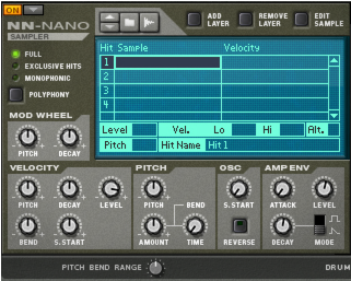 The NN-Nano can handle samples or sets of samples for each of the four different Hit Types described in “Assigning Hit Type to Pads”. Each Hit Type can contain one or several samples which can be layered and/or altered and controlled individually via velocity.