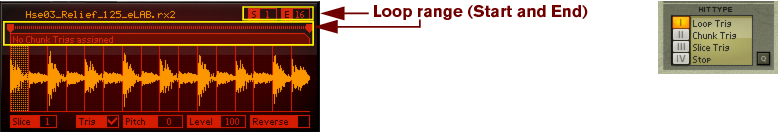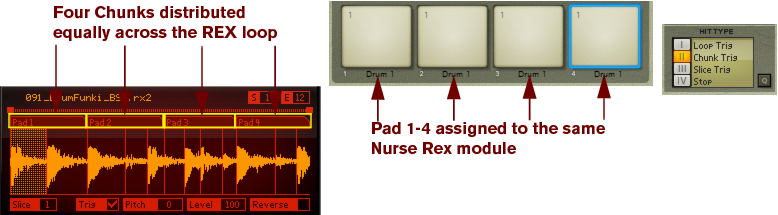 • The Nurse Rex can load standard REX files and play back the loops and/or slices in a variety of ways depending on the selected Hit Type (see “Assigning Hit Type to Pads”).In Loop Trig mode, you trig the REX loop to play one single cycle every time you hit the assigned pad. Loop Trig can also be used together with the “Stop” mode on another pad to immediately stop the loop playback, see “Stop” below.In Chunk Trig mode, you can assign several pads to play back shorter sections - chunks - of the REX loop. The number of chunks is determined by the number of pads you have assigned to the REX loop using the Chunk Trig Hit Type. The chunks are distributed in equal sections across the REX loop. Chunk Trig can also be used together with the “Stop” mode on another pad to immediately stop the chunk playback, see “Stop” below.