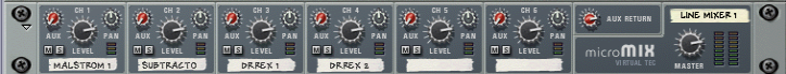 The Line Mixer 6:2 Introduction The Line Mixer 6:2 allows you to control the level, stereo placement (Pan) and effect mix (AUX Send) of each connected audio device. The Line Mixer is configured with 6 (stereo) input channels, which are combined and routed to the Left and Right Master outputs.