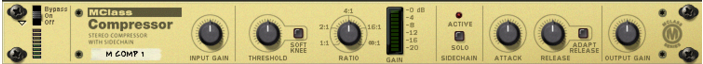 The MClass Compressor This is a single-band compressor capable of everything from subtle compression to aggressive pumping effects. Like all dynamics processors it is best used as an insert effect. The features include “soft-knee” compression for more musical and unobtrusive compression, program-adaptive release time and a sidechain input for de-essing and other dynamics processing. Additionally, you have a CV output, allowing you to have the amount of gain reduction control other Reason parameters. Parameters: | Parameter | Description Input Gain The Input Gain controls the ”drive” of the compression. This determines how much compression the signal will have in conjunction with the Threshold. Range: ±12 dB. Threshold This sets the level at which onset of compression occurs. When the input level is below the Threshold setting the signal is unaffected. When the input level exceeds the threshold, compression kicks in. In practice, this means that the lower the Threshold setting (and the higher the Input Gain), the more compression will be applied. Range: -36 dB to 0 dB Soft Knee Normally signals above the threshold will be compressed immediately at whatever ratio is set. This can be very noticeable, especially when using high compression ratios. When Soft Knee is activated, the onset of compression will be more gradual, producing a less drastic result. Ratio This lets you specify the amount of gain reduction applied to the signals above the set threshold. The Ratio can be set from 1:1 (no reduction) to ∞:1 (Infinite). Gain meter This shows the amount of gain reduction (in dB). Solo Sidechain This allows you to monitor the signal connected to the sidechain input (see below). Attack This governs how quickly the compressor will apply its effect when signals rise above the set threshold. If you raise this value, the response will be slower, allowing more of the signal to pass through the compressor unaffected. Typically, this is used for preserving the attacks of the sounds. Range: 1ms to 100ms. Release When the signal level drops below the set threshold, this determines how long it takes before the compressor lets the sound through unaffected. Set this to short values for intense, “pumping” compressor effects, or to longer values for a smoother change of the dynamics. Range: 50ms to 600ms. Adapt Release When this is used, set Release to the time you want for short peaks - when longer peaks occur, the Release time is automatically increased. Output Gain This controls the output gain and can be used to compensate for the gain reduction caused by compression. Range: ±12 dB. About the Sidechain inputs When a signal is connected to the Sidechain inputs, it is this signal that will trigger the compression. This signal is not passed to the compressor output, and will thus not be heard (unless Sidechain Solo is activated). The signal connected to the normal L/R inputs is the signal that will be processed by the compressor (as usual). Here follows two examples of how you can use sidechain processing: Example 1 - using the Sidechain inputs to create ducking effects “Ducking” is when the level of one signal is reduced by the presence of another signal. A typical application is to automatically lower the level of a musical bed when a voice-over starts, and to automatically bring the level up when the voice-over stops. To set this up, we can name the musical bed in the example “Device A”, and the voice-over “Device B”. Proceed as follows: 1. Connect Device A and Device B to separate channels on a mixer device. In this example the signal produced by Device A should be continuous, and the signal produced by Device B should be intermittent, i.e. it should contain both silent passages and signal passages. 2. Select Device A and then select an MClass compressor from the Create menu. The effect will be auto-routed as an insert effect to Device A. 3. Connect a Send on the mixer device to the Sidechain inputs on the MClass compressor. As soon as anything is connected to the Sidechain inputs, the “Active” indicator lights up on the device panel. The compressor will no longer react to the signal produced by Device A. 4. Turn up the corresponding AUX Send level for Device B on the mixer. This means that the Device B signal now feeds both the mixer's input, and the sidechain input on the compressor, which in turn triggers the gain reduction. 5. If you now start playback of both devices, the level of Device A will be lowered whenever Device B sounds, and be raised again when Device B stops. The amount of gain reduction, how quickly it lowers the level, and the time it take for the level to return to normal again is determined by the corresponding Gain/Threshold/Ratio and Attack/Release parameters. Example 2 - using the Sidechain inputs to create frequency sensitive compression By inserting an equalized signal to the sidechain inputs you can make the compression more or less sensitive to a certain frequency range. A typical application of this is “de-essing” - where harsh “S”-sounds in vocal material is reduced or eliminated. Frequency sensitive compression is set up as follows: 1. Hold down [Shift] and create an instrument device. Pressing [Shift] means no auto-routing connections to/from the device are made. 2. Hold down [Shift] and create a MClass Equalizer. 3. Hold down [Shift] and create a MClass Compressor. 4. Create a Spider Audio Merger and Splitter device. 5. Connect the outputs of the instrument device to the A and B inputs on the Spider. 6. Route one pair of the split outputs of the Spider to the MClass Equalizer inputs. 7. Route the Equalizer outputs to the Sidechain inputs on the MClass Compressor. 8. Route another pair of the split outputs of the Spider to the MClass Compressor. Now, the compressors normal audio inputs are fed the unprocessed signal, and the sidechain inputs are fed the equalized signal. 9. Next, route the outputs of the Compressor to inputs on a mi