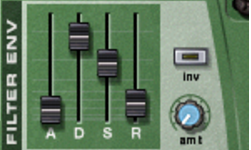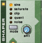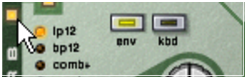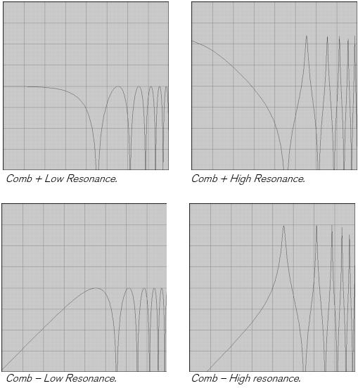 The Filter section The filter section lets you further shape the overall character of the sound. Contained herein are two multimode filters, a filter envelope and a waveshaper. The Filters Both filter:A and filter:B have the exact same parameters, all of which are described below. To activate/deactivate a filter, click the On/Off button in the top left corner. When a filter is activated, the button is lit. An activated filter. Filter types To select a filter type, either click the Mode button in the bottom left corner or click directly on the desired filter name so that it lights up in yellow: • LP 12 (12 dB lowpass) Lowpass filters let low frequencies through and cut off high frequencies. This filter type has a roll-off curve of 12dB/Octave. • BP 12 (12 dB bandpass) Bandpass filters cut both high and low frequencies, leaving the frequency band in between unaffected. Each slope in this filter type has a 12 dB/Octave roll-off. • Comb + & Comb – Comb filters are basically delays with very short delay times with adjustable feedback (in Reason controlled with the Resonance knob). A comb filter causes resonating peaks at certain frequencies. The difference between “+” and “–” is in the position of the peaks, in the spectrum. The main audible difference is that the “–”-version causes a bass cut.The Resonance parameter in both cases controls the shape and size of the peaks. • AM AM (Amplitude Modulation) is often referred to as Ring Modulation. A Ring Modulator works by multiplying two signals together. In the case of the Malström, the filter produces a sine wave which is multiplied with the signal from osc:A or osc:B. Resonance controls the mix between the clean and modulated signals. The Ring Modulated output will then contain added frequencies which are generated by the sum of, and the difference between the two signals. This can be used for creating complex, non-harmonic sounds. Filter controls Each filter contains the following four controls: • Kbd (keyboard tracking) By clicking this button so that it is lit, you activate keyboard tracking. If keyboard tracking is activated, the frequency of the filter will change according to the notes you play on your keyboard. That is, if you play notes higher up on the keyboard, the filter frequency will increase and vice versa. If keyboard tracking is deactivated, the filter frequency will remain at a fixed value regardless of where on the keyboard you play. • Env (envelope) If you click on this button so that it is lit, the cutoff frequency (see below) will be modulated by the filter envelope. If you leave this deactivated, the Filter Envelope will have no effect. • Freq (frequency) The function of this parameter depends on which filter type you have selected: With all filter types except AM, it is used for setting the cutoff frequency of the filter. In the case of the lowpass filter for example, the cutoff frequency determines the limit above which high frequencies will be cut off. Frequencies below the cutoff frequency will be allowed to pass through. The farther to the right you turn the knob, the higher the cutoff frequency will be. If you have selected AM as filter type, this will instead control the frequency of the signal generated by the filter. The same control range applies though; the farther to the right you turn the knob the higher the frequency will be. • Res (resonance) Again, the function of this parameter depends upon which filter type is selected: If the selected filter is any other type than AM, it sets the filter characteristic, or quality. For the lowpass filter for example, raising the filter Res value will emphasize the frequencies around the set filter frequency. This generally produces a thinner sound, but with a sharper, more pronounced filter frequency “sweep”. The higher the filter Res value, the more resonant the sound becomes until it produces a whistling or ringing sound. If you set a high value for the Res parameter and then vary the filter frequency, this will produce a very distinct sweep, with the ringing sound being very evident at certain frequencies. In the case of the AM filter type though, this control instead regulates the balance between the original signal and the signal resulting from amplitude modulation. The farther to the right you turn the knob, the more dominant the AM signal will be. The Filter Envelope This is a standard ADSR envelope with two additional controls; inv and amt. The filter envelope is common for both filter:A and filter:B, and controls how the filter frequency should change over time. Inv (inverse) This button toggles inversion of the envelope on and off. The Decay segment of the envelope will for instance normally lower the frequency, but if the envelope is inverted it will instead raise the frequency. Amt (amount) This controls to which extent the filter envelope affects the filters, or rather - the set filter cutoff frequencies. For example; if the cutoff frequency is set to a certain value, the filter will already be opened by this amount when you hit a key on your keyboard. The amount setting then controls how much more the filter will open from that point. Turn the knob to the right to increase the value. For an overall description of the general envelope parameters (Attack, Decay, Sustain, Release), please refer to the Subtractor chapter. The Shaper Before filter:A is an optional waveshaper. Waveshaping is a synthesis method for transforming sounds by altering the waveform shape, thereby creating a complex, rich sound. Or, if that’s more to your taste, truncating and distorting the sound to lo-fi heaven! A guitar distortion box could be viewed as a type of waveshaper for example. An unamplified electric guitar produces a sound with fairly pure harmonic content, which is then amplified and transformed by the distortion box. To activate/deactivate the Shaper, click the On/Off button in the top left corner. When the Shaper is activated, the