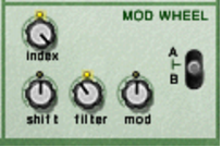 • This sets modulation wheel control of the currently active graintable’s index (see “Controlling playback of the graintable”) for osc:A and/or osc:B. Positive values will move the index position forwards if the modulation wheel is pushed forward. Negative values will move it backwards.