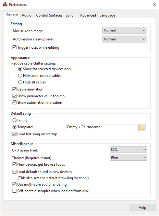 • See “Cable appearance” for more details.It’s possible to specify a certain song document which will automatically open as a “template” each time you select “New” from the File menu. The Default Song could be an empty document, a song you have created earlier, or a factory made Template song. See “Setting up a Default Song” for information on how to select Default Song.Here you can choose from a couple of different visual themes, i.e. how the user interface should be visually presented. The selected theme/color affects the Sequencer, Browser and Transport Panel areas. See “About different Themes”.See “Audio Basics” for more information on how Reason handles audio.