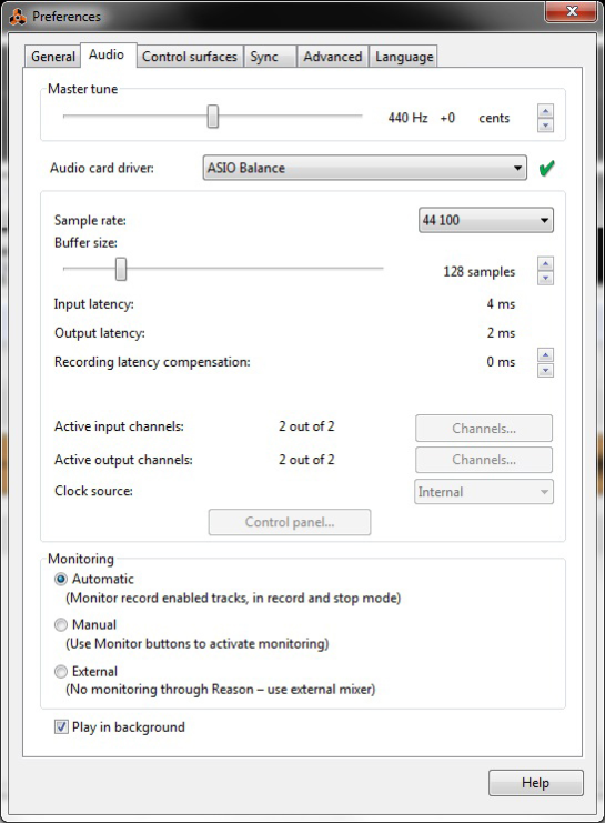 • The Sample Rate can be specified on the Audio tab in the Preferences dialog. See “Sample Rate settings for recording and playback” for more details.The Buffer Size determines the Input and Output Latency of the audio. Generally, the smaller the Buffer Size, the lower the latency. However, too low a Buffer Size setting could result in clicks, pops, dropouts, etc. in the audio. Therefore, the Buffer Size should be set to an “optimal” value rather than to the lowest value. See “Buffer Size settings” for more information.See “About latency” for more information.If you are monitoring via an external mixer, and have selected “External” in the “Monitoring” section on the “Audio” page in Preferences (see “Monitoring”), there might be situations where you experience that the recorded audio is generally played back too early - or too late - in the song. This could be because the latency values reported to Reason by the audio card were not completely accurate.See “Recording Latency Compensation” for information.Active inputs and outputs will be also indicated with yellow and green LEDs in the Reason Hardware Interface - see “How Reason communicates with your audio hardware”.Record enabling of audio tracks is done by clicking the Record Enable button on the track in the track list - see “Record enabling”.
