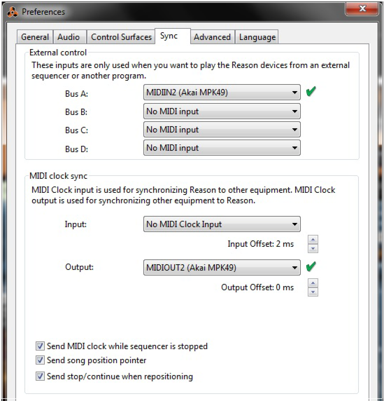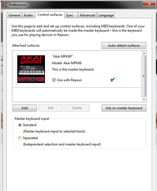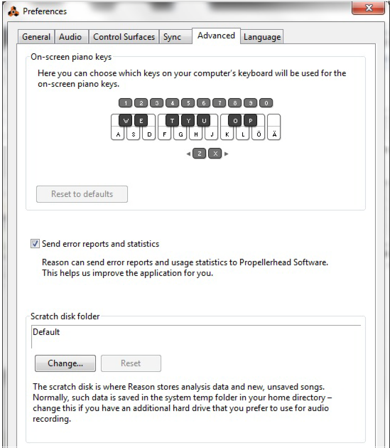Note that if you have selected “Standard” in the “Master Keyboard Input” section on the “Keyboards and Control Surfaces” page in Preferences (see “The Master Keyboard Input setting”), selecting an audio track also automatically record enables it - and consequently enables monitoring in “Automatic” mode.The surface designated as Master Keyboard cannot be locked to a specific device - it always follows the sequencer Master Keyboard Input. By selecting the Master Keyboard surface in the Attached Surfaces list and clicking this button allows you use Surface locking, although you will not be able to play the device. See “Locking a surface” in the Remote chapter for details.Finally you return to the Control Surfaces Preferences page, where your added surface is now listed.This could be an external hardware sequencer or sequencer software that is installed on the same computer as Reason. See the chapter “Synchronization and Advanced MIDI” for more details.As part of the MIDI Clock standard there are also options for sending out Start, Stop, Continue and Song Position Pointers, see “Using Reason as MIDI Clock master”.See the “Synchronization and Advanced MIDI” chapter for more information.See “Adjusting for Latency” for more information.See the “On-screen Piano Keys” chapter for information on how to use the On-screen Piano Keys.Here you can select where you want to locate the Scratch Disk Folder. The Scratch Disk Folder is a temporary storage for recorded audio files before they have been manually saved in a song document file. By default, Reason places the Scratch Disk folder in the system temp folder in your home directory. You can manually change the Scratch Disk folder location if you like. See “Changing Scratch Disk folder location” for more information.