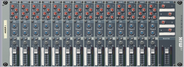 Mixer 14:2 Introduction The Mixer 14:2 allows you to control the level, stereo placement (Pan), tone (EQ) and effect mix (AUX Sends) of each connected audio device. If you have ever used a conventional hardware audio mixer, you will most likely find the Mixer very straightforward to use. It is configured with 14 (stereo) input channels, which are combined and routed to the Left and Right Master outputs. The vertical channel “strips” are identical and contain - from the top down - four Auxiliary Sends, an EQ section, Mute and Solo buttons, Pan control, and a Level fader. Every mixer parameter can of course be automated.