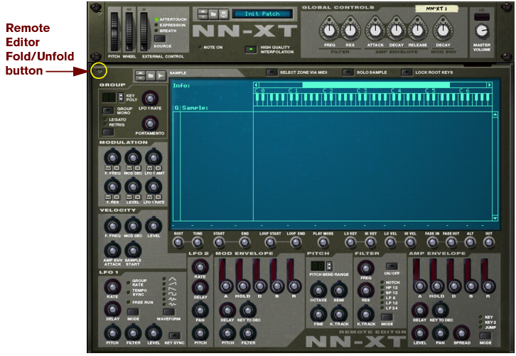 Panel overview The main panel When the NN-XT is added to the rack, you will initially only see the main panel. The NN-XT main panel. The main panel is where you load complete sample patches. It also contains the “global controls”. These are controls that affect and modify the sound of entire patches rather than the individual key zones. The Remote Editor panel To show/hide the remote editor panel, use the fold/unfold arrow at the bottom left. The remote editor panel is where you load individual samples, create key maps, modify the sound of the samples with synth parameters etc. The main panel of the NN-XT can be folded like any other Reason device. Note that folding the main panel will also fold the remote editor regardless of its current state.