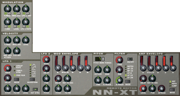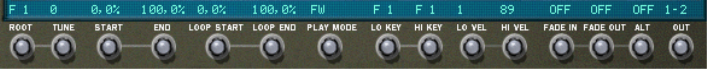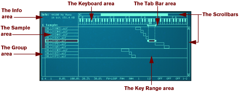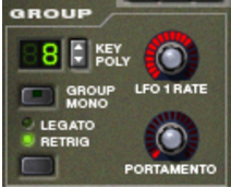 This area does not show any information. However, by clicking in it, you can instantly select all the zones that belong to a certain group. See “Working with Grouping” for information on how to create groups.Aside from the fact that is a guideline for setting up key ranges, it is also used for setting the root keys of, and auditioning loaded samples. See “About the Root Key” and “Auditioning samples” respectively for more information.These parameters are adjusted on a per group basis (see “Group parameters” for more information on groups). Most of them relate to performance or playing style.