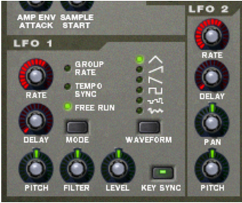 • NN-XT features two Low Frequency Oscillators - LFO 1 and LFO 2. “Normal” oscillators generate a waveform and a frequency, and produce sound. Low frequency Oscillators on the other hand, also generate a waveform and a frequency, but there are two major differences:In this mode, the LFO will run at the rate set for its group in the group section, rather than at the rate set here (see “Group parameters”). This way, all zones in the group will have the exact same modulation rate.