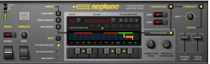 Neptune Pitch Adjuster and Voice Synth Introduction The Neptune Pitch Adjuster and Voice Synth device is a combined monophonic vocal pitch corrector, pitch shifter and polyphonic voice synth. Neptune was designed with focus on high-quality vocal processing but can also be used on other material. However, due to the signal characteristics of other types of audio (complex inharmonic instrument sounds, polyphonic material etc.) the result of the pitch adjustments might not be what you would expect. Don’t hesitate to experiment, though! Used as a pitch corrector, Neptune can automatically correct flat monophonic input signals and output corrected notes in real-time. The pitch correction can be adjusted from totally transparent to hard, robot-like. The correction can be controlled from predefined scales, from input MIDI notes or from a combination of both! When used as a pitch shifter, Neptune performs overall pitch-shifting of incoming monophonic audio in real-time and transposes the output to a defined value within a ±1 octave range. The Voice Synth section in Neptune allows you to add additional voices - harmonies - to a monophonic vocal input signal and to control the voices via MIDI - from sequencer notes or by playing on your MIDI master keyboard. Neptune also features controls for adjusting formants and for adding pitch bend and vibrato to the processed signal. It’s also possible to correct and edit monophonic pitches graphically in Audio Pitch Edit Mode in the Reason sequencer, see “Editing audio in Pitch Edit mode”. Typical use cases Neptune can be used in a variety of ways and situations. Here are some examples: • Pitch correction of a vocal track Neptune is used as an Insert Effect on the vocal audio track, with the Pitch Adjust’s Scale set to desired scale. Set the Correction Speed parameter to a moderate value for transparent pitch correction - or set the Correction Speed parameter to max value and the Preserve Expression parameter to minimum for a hard “robotic” character. • Octave dub Neptune is used as a Send Effect. The Pitch Adjust section is turned off and the Transpose section is activated. The Semi parameter is set to +12 to transpose up 1 octave. The Send FX control on the mixer is used for balancing the level of the octave-shifted voice. The Formant Shift control is used for making the transposed voice sound more natural (or unnatural, if that's desired). • Create backing harmonies on a vocal track Neptune is used as an Insert Effect on the vocal audio track and MIDI Input is routed to the Voice Synth via the Neptune sequencer track. Play some notes on your MIDI master keyboard and use the Voice Synth breakout jacks connected to a separate Mix Channel for further processing. • Pitch shift drums (non-pitched input) The Pitch Adjust section is turned off and the Transpose section is activated. The Transpose parameters are set to desired values. • It is also possible to perform other tricks, as described in “Pitch adjustment tips and tricks”.