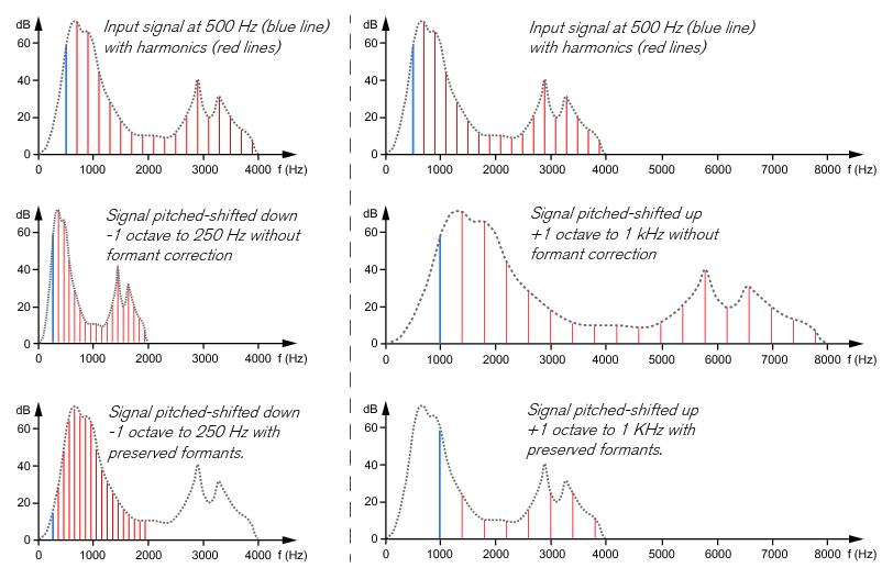 Using Formant control What are formants? Formants can be described as a sonic “footprint” of an acoustic space. The practical effect of formants could be compared to a multi-peak filter acting on the frequencies in a sound. An acoustic guitar, for example, has a body shape which makes is sound the way it does. The same goes for a human vocal tract (throat and mouth cavity); every human vocal tract has a unique “shape” which gives the voice its character. It is these shapes that produce formants. A big difference between a vocal tract and a guitar body, though, is that the vocal tract changes shape as you sing different vowels. This also means that the formants will change. When you pitch shift a signal up or down, the formant “multi-peak filter” will move up or down with the signal frequency (just like a traditional synthesizer filter would with full keyboard tracking activated). The result will be a signal that not only is pitched but also changes character. In some situations this might be what you want, but when it comes to pitch shifting vocals you will probably often want the pitch-shifted signal to sound like it’s sung by the same person. Therefore, Neptune features a formant control function. The Formant section in Neptune lets you control the formants so they don’t move along with the pitched signals. Neptune continuously samples and analyses the input audio and determines both the pitch and the current formants of the signal in real-time. The formants are then automatically applied to the pitch-adjusted output signal in real-time. The picture below shows schematic examples of a 500 Hz signal, pitch-shifted down and up one octave respectively, without and with formant correction. The formants are the peaks of the gray dotted lines in the graphs: Pitch-shifting without and with formant correction applied. The left column shows -1 octave pitch-shifting and the right column +1 octave. Using the Formant function When the Formant section is not active, the formants will move along with the pitched signal. On vocals this could generate unnatural “gender change” effects, especially on heavily pitched voices. If this is not the desired effect, you should activate the Formant section: 1. Activate the Formant function by clicking the Formant button. 2. Adjust the Formant shift with the Shift knob. The Shift range is ±1 octave. • The default 12 o’clock position means that the formants will be “locked” to the input signal and won’t move with the shifted pitches. Used on vocals this will give the impression of the same person singing at the adjusted pitches. (Refer to the picture in the “What are formants?” section for graphical examples of this particular Shift setting.) • Turned further counter-clockwise, the formants will be “locked” to the input signal and displaced downwards relative to the input signal. Used on vocals this will give the impression of a more deep male character voice. • Turned further clockwise, the formants will be “locked” to the input signal and displaced upwards relative to the input signal. Used on vocals this will give the impression of a more soprano/female/child character voice. Note that Voice Synth has its own separate “built-in” formant correction and is not affected by the Formant section settings.