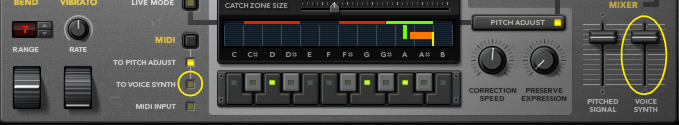 Using the Voice Synth The Voice Synth function lets you use Neptune as a harmony processor to generate polyphonic voices out of a monophonic input signal. The application is similar to how you would use a vocoder, such as the BV512 Vocoder, for example. However, using the Voice Synth in Neptune will produce completely transparent and natural sounding harmonies with pitches controlled from MIDI Note data. 1. Create a sequencer track for the Neptune device and select the Neptune track in the Track list. 2. Click the MIDI radio button to select “To Voice Synth” in the “MIDI” section. Also make sure the Voice Synth volume slider is raised: • When you sing through Neptune and hold down a note or a chord on your MIDI master keyboard, the output pitch(es) will correspond to the held MIDI note(s). • The Voice Synth harmonies will also respond to any Pitch Bend and Vibrato modulation. The parameters in the Pitch Adjust, Transpose and Formant sections are ignored by the Voice Synth. You can mix Pitched Signal with the Voice Synth signal in the Mixer section. If you only want the Voice Synth sound, lower the Pitched Signal fader.