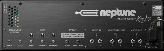 The Note input allows you to control the pitch of either the Pitch Adjust or Voice Synth (depending on what is currently selected in the MIDI Input section - see “MIDI Input”). The pitch could be controlled from a Note CV output of a Matrix or an RPG-8, for example.The Pitch Bend input allows you to control pitch bend of either the Pitch Adjust or Voice Synth (depending on what is currently selected in the MIDI Input section - see “MIDI Input”). The pitch bend could be controlled from a Pitch Bend CV output of an RPG-8, for example.The Mod Wheel input allows you to control the Vibrato amount of either the Pitch Adjust section or Voice Synth (depending on what is currently selected in the MIDI Input section - see “MIDI Input”). The Vibrato could be controlled from a Mod Wheel CV output of an RPG-8, for example.The Left and Right outputs are the main stereo outputs of Neptune. Here, the audio from the Pitch Adjust, Transpose and Formant sections are routed. If the Voice Synth Sep Output (see “Voice Synth Out”) are not connected, the Voice Synth audio output are also routed to the main outputs.