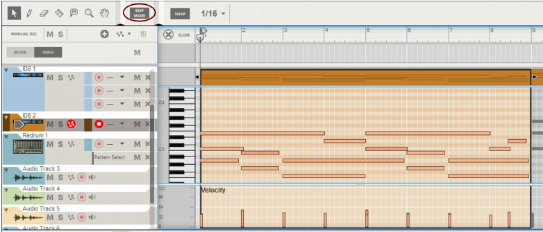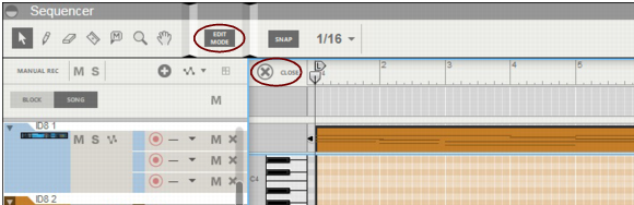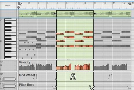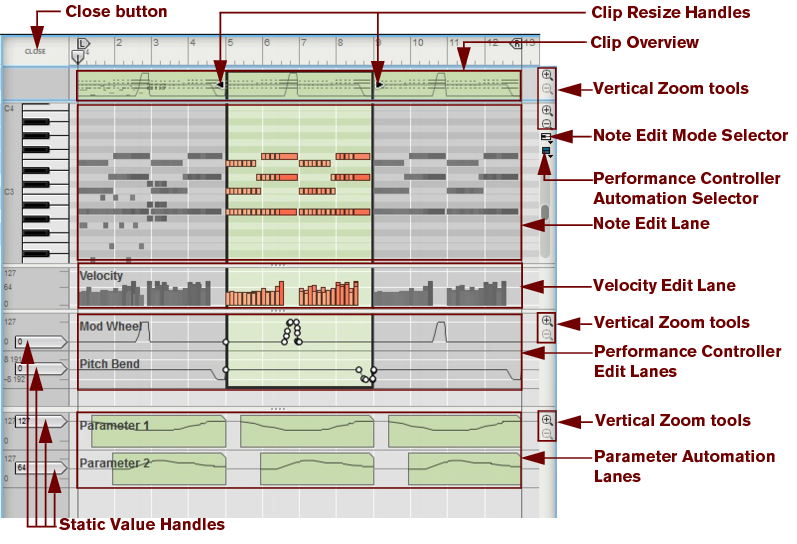 Also, all parameter automation lanes will be shown at the bottom of the Edit Pane. If a single clip was selected on the note lane with edit focus when you switched to Edit Mode, it will automatically be opened. If no clip was selected, the events will be grayed out. To be able to edit or draw notes and/or automation events, you need to open the clip, for example by double-clicking it (see “Opening note and automation clips for editing”).Note clips can contain both note events - with velocity values - and performance controller events. By default, performance controllers include Mod Wheel, Pitch Bend, Sustain Pedal, Aftertouch, Expression and Breath Controller. However, the controller configuration can easily be changed (see “Creating new performance controller automation lanes” and “Deleting performance controller automation lanes”).See “Editing parameter automation in the Song/Block View” for information on how to edit parameter automation events in the Song/Block View.See “Editing parameter automation in Edit Mode” for information on how to edit parameter automation events in Edit Mode.To the right of the Note Edit Lane, below the Vertical Zoom tools, is the Note Edit Mode Selector. Click to choose between Key Edit, Drum Edit or REX Edit Mode. Depending on selected mode, the Note Edit Lane will display differently. See more about the different modes in “Note Edit Modes”.Each performance controller you used when recording the note clip has its own separate Performance Controller Edit Lane. You can add or delete performance controller edit lanes from the clip using this selector. See the “Creating new performance controller automation lanes” and “Deleting performance controller automation lanes” for more details.Here you can edit the notes of one open clip at a time. Note events are displayed as orange horizontal “boxes” in a piano roll fashion on the Note Edit Lane. The left side of each box indicates Note On (key down) and the right side Note Off (key up). The color intensity of each box indicates the velocity for the corresponding note. Depending on selected Note Edit Mode (see “Note Edit Modes”), the contents of the Note Edit Lane will display differently.The Velocity Edit Lane shows the velocity values for each of the recorded notes. Velocity values are automatically recorded together with notes. See more about editing velocity values in “Editing note velocity”.On the Performance Controller Edit Lanes are the performance controller events for Mod Wheel, Pitch Bend, Sustain Pedal etc. Performance controller events are automatically distributed on separate lanes for each recognized controller during recording. Even though performance controllers belong to separate note clips, they will affect all active parallel note lanes on a track. See “Automation editing” for details on how to edit performance controller events.Any recorded parameter automation will be shown in separate clips, on separate Parameter Automation Lanes. Parameter automation clips don’t “belong” to the note lane or to any note clips, and will not be opened together with note clips. Double-clicking on a parameter automation clip will open it for editing. See “Automation editing”.The Static Value Handles to the left of the Performance Controller Edit Lanes and Parameter Automation Lanes indicate to what value the automated controller/parameter will default to where there are no clips on the lane. Basically, this value reflects the parameter’s initial value, before it was automated. You can easily change a parameter’s Static Value by dragging the Static Value Handle up or down. See “Automation editing” for more details.