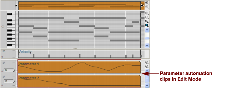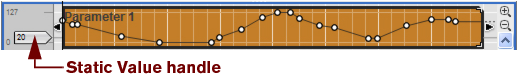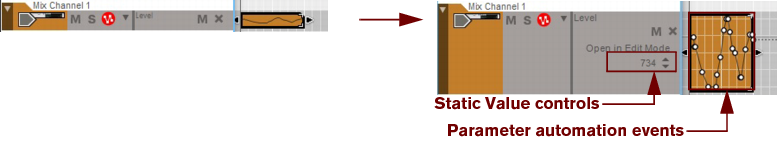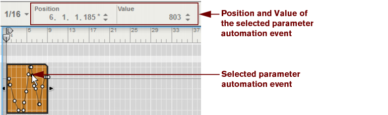 Here you can edit the parameter’s Static Value (see “Static Value Handles”) with the up/down arrow buttons to the left of the open clip. Alternatively, double-click and type in a new Static Value in the box.In the open parameter automation clip, it’s possible to move, add and delete automation events in the same way as in Edit Mode using the Selection (Arrow), Pencil and Eraser tools - see “Editing parameter automation in Edit Mode”.The event’s position and value can be edited numerically in the displays - see “Note and automation editing in the Inspector”.