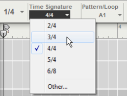 It is generally a good idea to activate Snap (see “Snap”) and have the Snap value set to “Bar” when drawing clips.The available signatures are: 1/2-16/2, 1/4-16/4, 1/8-16/8 and 1/16-16/16. The Time Signature display in the dialog can be edited according to the descriptions in “Transport Panel segment displays”.