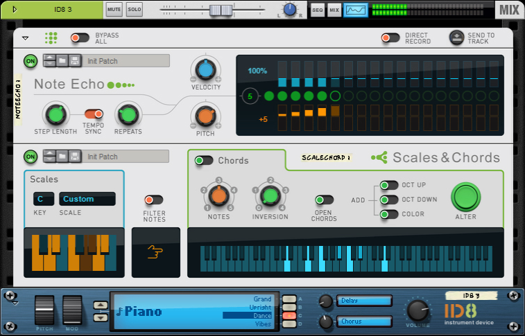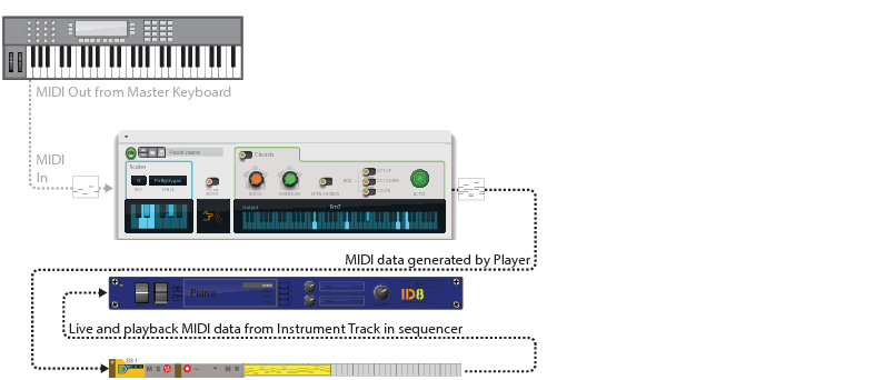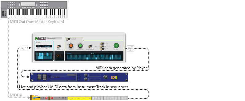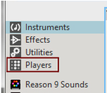 Overview A Player is a special type of device that automatically processes, filters and generates MIDI Notes, based on input MIDI Notes to an Instrument device in the rack. If you like you could view Players as “MIDI Insert effects”, that sit in between your MIDI Control Keyboard (or the On-screen Piano Keys) and Instrument device. The Player devices can be found in the Players palette below Utilities in the Reason Browser: The Players palette in the Browser. The basic idea behind Players is that you first create an Instrument device (or instrument track), then hook up one or more Player devices to the Instrument device. If the Player device is a chord generator, for example, you can have it generate chords in the desired key and scale by just playing single notes on your MIDI Control Keyboard. Absolutely great for inspiration! Player devices are a little narrower than regular devices, and are always created directly above their corresponding Instrument device(s) - between the Instrument and the Mix Channel devices: Two Player devices (in series) attached to an ID8 Instrument device in the rack. Recording modes Recording Instrument tracks using Players can be done in two different ways: • By recording the notes exactly as you play them on your MIDI Control Keyboard. This is the default mode and means you just record the notes straight onto the Instrument track from your MIDI Control Keyboard, just as you would a regular Instrument track (without any Player). During playback the recorded notes are then run through the Player, which generates the Player notes in real-time. • By recording the notes that are generated by the Player(s). This is called Direct Recording and means that instead of recording the notes you play on your MIDI control keyboard, you record the notes that are generated by the Player(s). This way you automatically get the rendered notes onto your Instrument track (as chords, arpeggios etc. depending on the Player(s)). During playback the recorded notes bypass the Player(s), so the result is exactly what you heard when you recorded. The pictures below illustrates the two different recording modes: The default recording mode principle. The Direct Record mode principle.