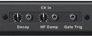CV Inputs On the back of the RV7000 Mk II you find three CV inputs. These are: | Parameter | Description Decay Controls the reverb decay or echo/delay feedback via CV. HF Damp Controls the HF Damp parameter on the main panel. Gate Trig Used for triggering the Gate section with a gate signal. The length of the gate signal determines the length of the gated reverb. Using the CV inputs to modulate the RV7000 Mk II in Convolution mode is not recommended.