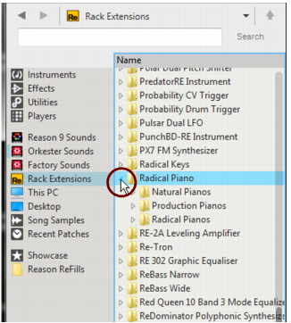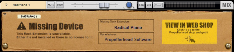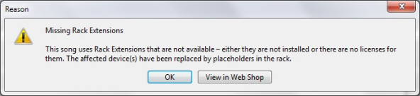 Using Rack Extensions in Reason Rack Extensions behave just like internal Reason devices, and are listed together with the Reason devices in the Create menu subgroups and on the Device Palette in the Browser: The Radical Piano Rack Extension is available from the Create menu and on the Instruments device palette in the Browser. The installed Rack Extension devices are sorted in the appropriate subgroups and are listed, per manufacturer, in alphabetical order. However, Rack Extension devices from Propellerhead are always placed first in the list, below the internal Reason devices. To create a Rack Extension device, either select it in the appropriate subgroup in the Create menu, double click or drag and drop from the Device Palette in the Browser, or select “Create Instrument...” or “Create Effect...” from the Create menu. The Rack Extension device is placed in the rack and routed according to the standard rules, see “Creating devices”. If a Rack Extension supports patches, you will find the included patches in the Rack Extension itself. To get there: 1. In the Browser, click "Rack Extensions" in the locations list to the left. This lists all available Rack Extensions in alphabetical order: 2. Double click a Rack Extension folder (or click the expansion triangle) in the list to browse its patch content. If you are browsing patches from a Rack Extension device (by clicking the “folder” button on the device panel), patches and folders for that specific device type are displayed in the Browser list right away. About missing Rack Extensions When you open a Reason song from another user, it may have been created with Rack Extensions that you don't have. It might be a song from a friend, or a song that you have made using a Rack Extension with a trial license (that has since expired). When you open such a song, the following alert appears: Now, you can choose to open the song without the Rack Extension(s), or go to the Propellerhead web shop and Try or Buy the missing Rack Extension(s). If you click OK, the song opens without the missing Rack Extension(s). All such missing devices in a song are replaced by generic placeholder devices: A “Missing Device” placeholder plate for a Rack Extension device, which is currently unavailable on your computer. The placeholder device itself will be silent. If it's an effect, it will bypass the sound (or be silent, if connected as a send effect). If you're collaborating with a friend you can safely save the song and send it back. When your friend opens the song, the Rack Extension device will be restored with all settings intact. Acquiring missing Rack Extensions If you change your mind and want to hear the song with the Rack Extension(s) included, you could either download a paid version or a trial version from the Propellerhead web shop: 1. Click inside the “View in web shop” area on the placeholder panel to get to the Propellerhead web shop and Try or Buy the Rack Extension: 2. After you have downloaded the (paid or trial) Rack Extension device(s), restart Reason and open the song again. Now, the Missing Device placeholders have been replaced by the downloaded Rack Extension(s) and the song will sound as originally intended.