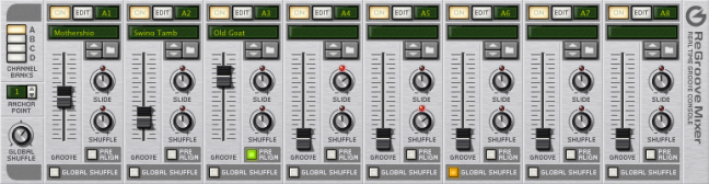 The ReGroove Mixer Introduction The ReGroove Mixer combines all the benefits of quantization, shuffle, and groove templates into a single integrated environment, giving you real-time creative control over the feel and timing of individual note lanes. The ReGroove Mixer, which extends from the top of the Transport Panel puts 32 channels of interactive groove control at your fingertips. If you're familiar with mixing, you're already well on your way toward understanding the ReGroove Mixer. Think of it as a mixer with 32 busses but, instead of these busses modifying the volume of the input tracks, they modify the feel (or groove) of the input tracks. You can route any note lane to one of ReGroove's 32 channels, and that lane's feel and timing are modified, in real-time, by the channel's settings. Each ReGroove channel can use its own groove template or shuffle amount. In addition, each channel can slide notes forward or backward in time, allowing you to put certain tracks slightly ahead or behind the beat, which greatly alters the feel of your music. Note that ReGroove only works for notes on note lanes. It’s also possible to lock a control surface to control the ReGroove Mixer parameters via Remote - see “Locking a surface”. ReGroove basics When working with grooves, you'll make use of three interacting sections within Reason's interface: • First, in the Sequencer, each note lane can be assigned to any of ReGroove's 32 channels. You assign a note lane to a groove channel by selecting it with the Select Groove pop-up in each note lane. • Second is the ReGroove Mixer, which contains both global groove settings and channel-specific ones. This is described on the following pages. • Finally, there's the Groove Settings section of the Tool Window, which is accessed by clicking a ReGroove channel's Edit button. Groove Settings allow you to set the intensity of various groove patch parameters. This is also where you save your own ReGroove patches. See “Groove Settings”.