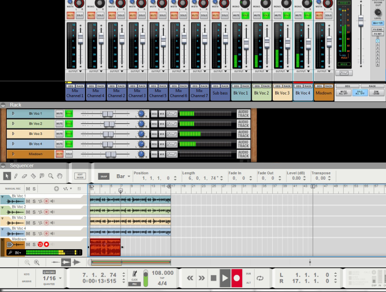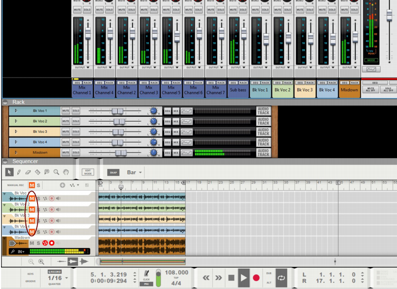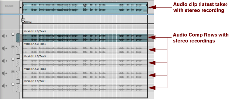 From here, it’s easy to assign the best parts from the different takes and comp them into a final clip. See “Creating a comped audio clip” for details.This will create a new audio track with a duplicate of the original audio track settings, including the channel strip settings (with insert effects etc.). Now, you can continue recording on the new audio track as described in “Recording audio” and “Recording audio in Loop mode”. Afterwards, you can edit the new track completely independently of the original track.Closely related to the “Dub” function, described in “Overdubbing audio using the “Dub” function”, is the “Alt” function. This function can be used to create a new audio track with an identical copy of the selected audio track’s settings. The only difference between the “Alt” and “Dub” functions is that the Alt function will automatically mute the original audio track.This will create a new audio track with a duplicate of the original audio track settings, including the channel strip settings (with insert etc.). Now, you can continue recording on the new audio track as described in “Recording audio” and “Recording audio in Loop mode”. Afterwards, you can edit the new track completely independently of the original track.If you start recording over an existing clip on an audio track, the new recording will incorporate (replace, but not erase) the previous recording in the clip. When you open the audio clip in the Comp Editor afterwards, there will be one Comp Row for each of the takes, the same result as when recording audio in Loop mode (see “Recording audio in Loop mode”).See “Creating a comped audio clip” for details on how to extract parts from individual takes and comp into a final clip.You might have the individual drums of your drum kit on separate tracks and these tracks are routed to a Mix Channel which is set to work as an Output Bus (see “Output Busses”). You then want to record the audio from the Output Bus onto a new Audio Track.In this situation, all you need to do is create a new Audio Track, activate the Rec Source button on the Output Bus Mix Channel device, and then select the Output Bus in the Select Audio Input drop-down list on the Audio Track in the Track List. Then, record the audio from the Output Bus as described in “Recording audio”.