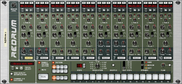 Redrum Drum Computer Introduction At first glance, Redrum looks styled after pattern-based drum machines, like the legendary Roland 808/909 units. Indeed, it does have a row of 16 step buttons that are used for step programming patterns, just like the aforementioned classics. There are significant differences, however. Redrum features ten drum “channels” that can each be loaded with an audio file, allowing for completely open-ended sound possibilities. Don’t like the snare - just change it. Complete drum kits can be saved as Redrum Patches, allowing you to mix and match drum sounds and make up custom kits with ease. In addition, Redrum also has sampling capability. This means that you can sample your own sounds straight into each of the ten drum channels with just a click of a button!