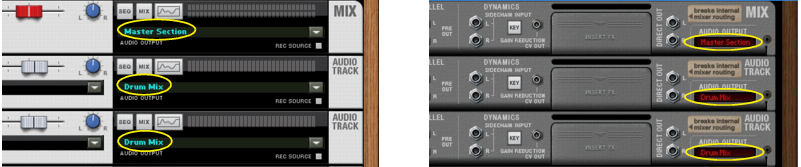 Signal types The following signal types are used in Reason: Audio signals Besides the Spider CV, Matrix Pattern Sequencer and the RPG-8 Arpeggiator, all Reason devices have audio connectors on the back. The audio connectors carry audio signals to or from devices via virtual cables. Audio connectors are shown as large quarter inch jacks. Audio Effects devices, which are used to process audio, have both audio inputs and outputs. Instrument devices, which generate audio, have either mono or stereo left/right audio output connectors. You do not have to use both outputs for devices with stereo outputs. Use the left output to use a mono signal from a stereo device. To monitor audio outputs from devices, the signals can be routed, either via the Main Mixer or directly, to the physical outputs of your audio interface via the Reason Hardware Interface (see “Manual audio routing”). Typically, if you are using an audio interface with stereo outputs, you will most likely use the Main Mixer to mix the audio signals to the master outputs. To route audio input signals from your audio interface to audio tracks in the sequencer, you just have to select the appropriate input(s) from the Audio Input drop-down list on the corresponding audio track (see “Selecting audio input(s) and defining mono or stereo”). This means that you never have to manually patch input signals from the Audio In jacks of the Reason Hardware Interface. For more information about signal paths in Reason, see “System signal paths”. CV/Gate signals In the early days of synthesizers, before the MIDI protocol was invented, analog synthesizers could be interconnected using Control Voltage (CV) cables. For example, one cable would be used for controlling pitch while another would send a Gate voltage, basically telling a synth when to play a note and when to stop. The CV signal cables in Reason emulate this analog control system. CV signals are typically used to modulate parameter values, and do not carry audio. CV/Gate connectors are shown as smaller mini jacks. CV is typically used for modulation purposes. For example, you could modulate a parameter with a CV signal generated by an LFO or an envelope generator on another device. Gate outputs/inputs are typically used to trigger events, such as note on/off values, envelopes etc. Gate signals produce on/off values, plus a “value” which could be likened to (and used as) velocity. You can only route CV/Gate signals from an output to an input (or vice versa). You cannot route an input to another input or an output to another output. P-LAN signals P-LAN is the internal system used for routing audio signals from Mix Channel and Audio Track devices to the Main Mixer Master Section device - and from Mix Channel/Audio Track devices to other Mix Channel devices that are used as Output Busses (sub-mixers). P-LAN connections are not indicated by cables or similar in the rack - only by an Audio Output display on the front and rear of Mix Channel and Audio Track devices: P-Lan signal destinations on Mix Channel and Audio Track devices (front and rear). If you use the Direct Out jacks on an Audio Track device or Mix Channel device, the internal P-LAN connection is broken. In this case, the audio from the Mix Channel/Audio Track device is not sent to the Master Section. About MIDI routing Normally, MIDI (e.g. note and performance data) are sent to devices from their respective sequencer track. No cables are used in the rack to indicate MIDI connections. For other ways to route MIDI to devices, see the chapters “Remote - Playing and Controlling Devices”, “Synchronization and Advanced MIDI” and “External MIDI Instrument”.