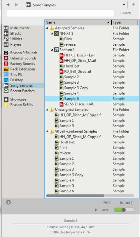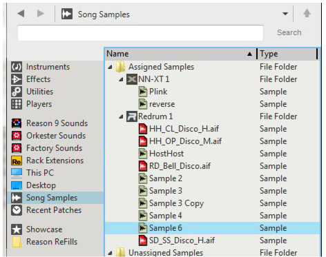 4. Here, all samples you use in your song are listed (see “The Song Samples location”). Here is also where you can open samples for editing (see “Editing samples”).Here, all samples that are assigned to devices in the song are listed. All devices that contain assigned samples are listed as “sub-folders”. Each device “sub-folder” shows the samples currently assigned to it. See “Assigned Samples” for more details.If you remove a sound you have sampled from a device, the sound is automatically moved from the Assigned Samples folder to the Unassigned Samples folder. From here you can load the sample into other devices if you like. See “Unassigned Samples” for more details.All sounds you have sampled yourself, plus any duplicated samples from the Factory Soundbank and/or ReFills, automatically becomes self-contained and are always stored with the song. These samples are listed in the All Self-contained Samples folder. See “About self-contained samples” for more details.Click the Edit button to open the selected sample for editing in the Edit Sample window (see “The Edit Sample window”).Select this to open the sample for editing in the Edit Sample window (see “The Edit Sample window”). If several samples are selected, this item is grayed out.Select this to create a duplicate of the selected sample. The duplicated sample is placed in the All Self-contained Samples and Unassigned Samples folders. Several selected samples can be duplicated in one go. See “Duplicating samples” for more details.Select this to export the selected sample to disk. A dialog appears where you can select file format. Note that it is not possible to export samples from the Factory Soundbank or from ReFills. Several selected samples can be exported in one go. See “Exporting samples” for more details.Select this to permanently delete the selected sample(s) from the song. Note that samples from the Factory Soundbank and from ReFills will not be deleted from their original locations - only from the song document. Several selected samples can be deleted in one go. See “Deleting samples from a song” for more details. Any samples you have recorded yourself will be permanently erased unless you have previously exported them to disk (see “Export Sample(s)” below).