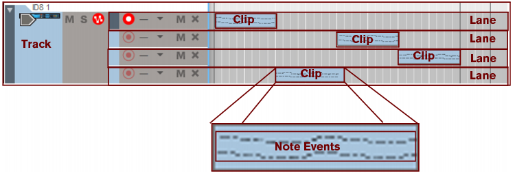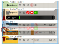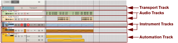 • Only one track at a time can have Master Keyboard Input. However, if you have locked additional MIDI keyboards to specific devices in the rack via Remote (see “Locking a surface”), you will be able to play and record these together with the track that has Master Keyboard Input.The Blocks track is present at the top of the Track List only when the Enable Blocks function on the Options menu is on. On the Blocks track you can create Block Automation clips to decide which Blocks should play back. Refer to “Working with Blocks in the Sequencer” for more information about the Blocks feature.The Transport track is always present at the top of the Track List and cannot be moved or deleted. The Transport Track can have a maximum of two lanes: one containing time signature automation, and the other containing tempo automation. See “Automating time signature” and “Editing tempo automation” for more details.An audio track can only have a single audio lane containing clips with mono or stereo audio recordings. However, each audio clip can contain several recordings, i.e. different "takes". You can view and comp these takes in the Comp Editor. See “Audio Editing in the Sequencer” for more details. An audio track can also have parameter automation lanes containing automation for the Audio Track Channel strip parameters in the Main Mixer.By default, the audio track is set up in mono. You can easily change to stereo by selecting “Stereo Input” in the “Audio Input” drop-down list - see “Selecting audio input(s) and defining mono or stereo”. If you select “Stereo Input”, the Audio Track channel strip in the Main Mixer automatically switches to a stereo channel.