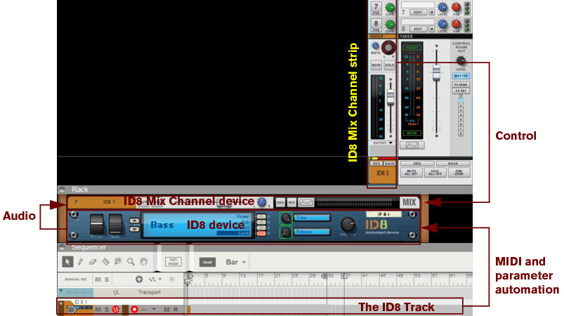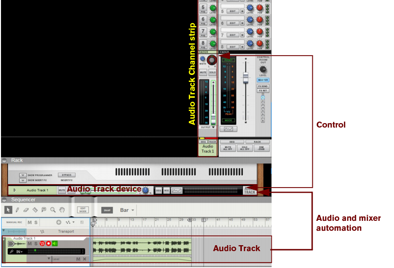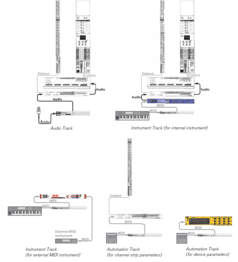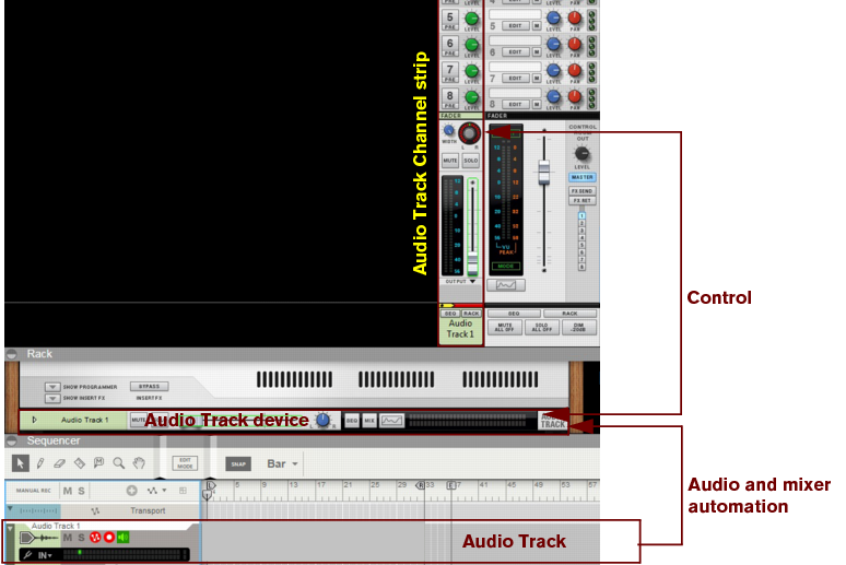 Note that when you create an instrument, the connected Mix Channel device doesn’t automatically get a track in the sequencer. If you want to record Mixer Channel automation, you have to first create a separate sequencer track for the Mix Channel device. See “Automation (non-instrument) track relationships”.If you want to control an external MIDI instrument from the Reason sequencer you have to use the External MIDI Instrument device (“External MIDI Instrument”). The device works as a MIDI router in which you can define which MIDI Out Port and MIDI Channel you want the MIDI signals to be sent to from Reason. Since there is no internal audio involved in this setup, there is no Audio Track device or Mix Channel device present in the configuration.A pure automation track is always associated with a “non-instrument” device, i.e. a device which can’t receive MIDI Note information. Consequently, an automation track can only consist of parameter automation lanes. Examples of non-instrument devices are Mix Channel devices with their corresponding Mix Channel strips, effect devices, mixer devices and Spider Merger & Splitter devices. The picture below shows an example with an automated Mix Channel:The standard way of routing MIDI from a connected MIDI master keyboard or control surface to a device in the rack is to set the Master Keyboard Input in the sequencer. When MIDI is routed to a selected track in the sequencer, the notes and controller data are automatically echoed to the associated device in the rack. However, it is also possible to set Master Keyboard Input from the rack, see “Playing devices from the rack”.By locking additional MIDI keyboards to separate devices in the rack, you will be able to play and record on several sequencer tracks simultaneously, see “Locking a surface”.Besides the standard routing described above, it’s also possible to lock certain rack devices to specific control surfaces. See “Locking a surface” for more details.It’s also possible to set Master Keyboard Input and track selection independently from each other by selecting “Separated” on the “Keyboards and Control Surfaces” page in Preferences - see “Preferences – Control Surfaces”.