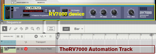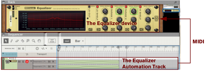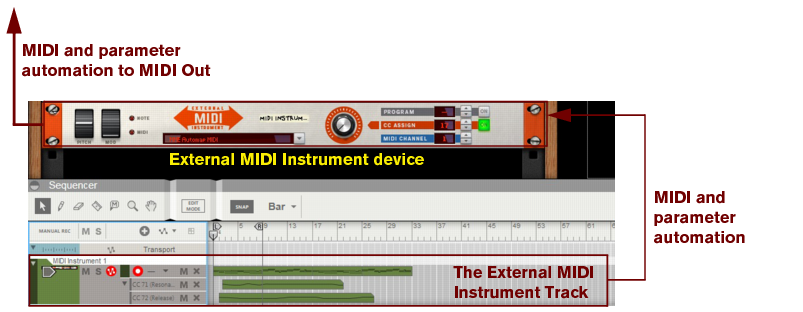 An External MIDI Instrument device is created in the rack and the associated track is automatically created in the sequencer. See “External MIDI Instrument” for more details on how to configure the External MIDI Instrument device for controlling external MIDI instruments.For non-instrument devices, such as effects devices and Mix Channel devices, you need to manually create a track if you want to record parameter automation. You can do that either by following the description below or by following either of the two last descriptions in “Creating/adding parameter automation lanes”.